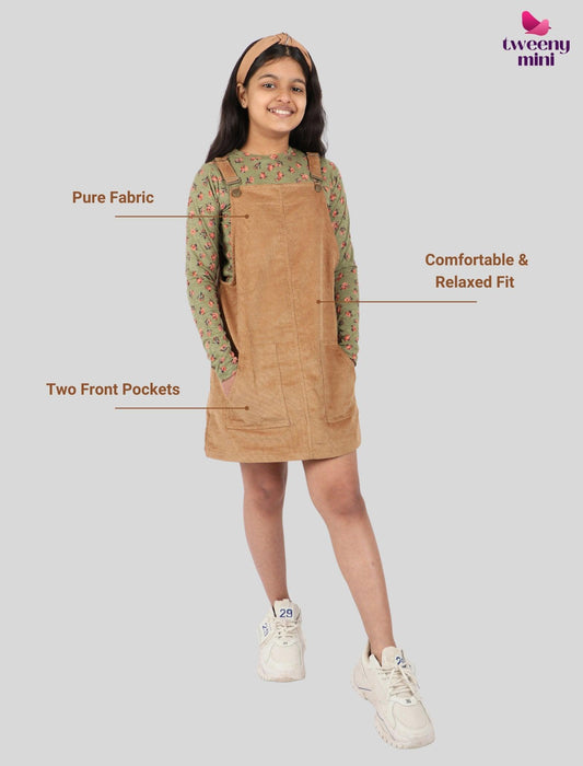 Classic Corduroy Kids Girls Pinafore Dress with Full Sleeve T-Shirt (Beige)