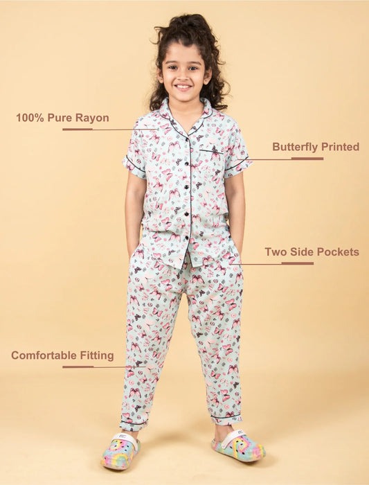 Pure Rayon Butterfly Printed Night Suits for Girls Kids (Blue)