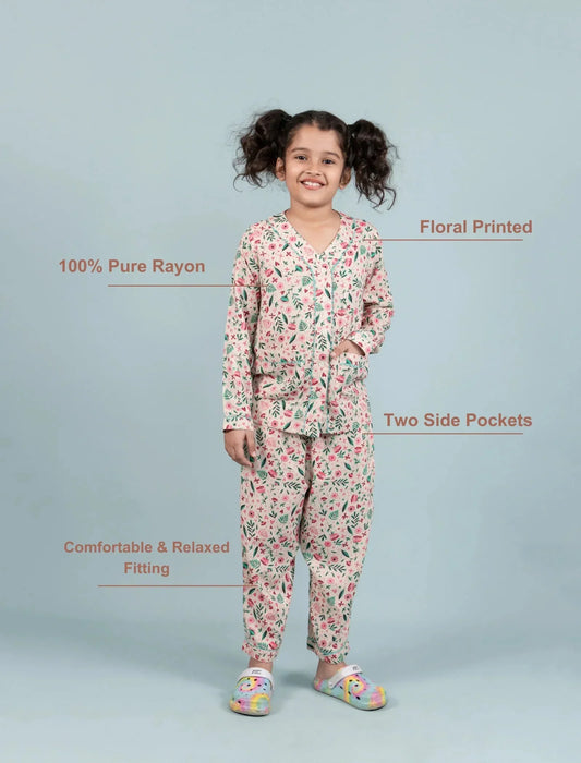 Pure Rayon Floral Night Suit for Girls Kids with Pyjama Set (Full Sleeves, Beige)