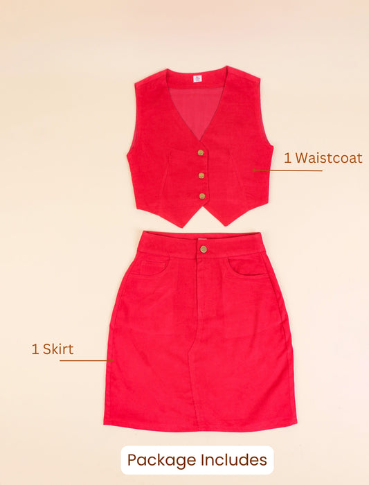 Cordy Chic Winter Corduroy Waistcoat with Skirt Set for Girls Kids (Red)