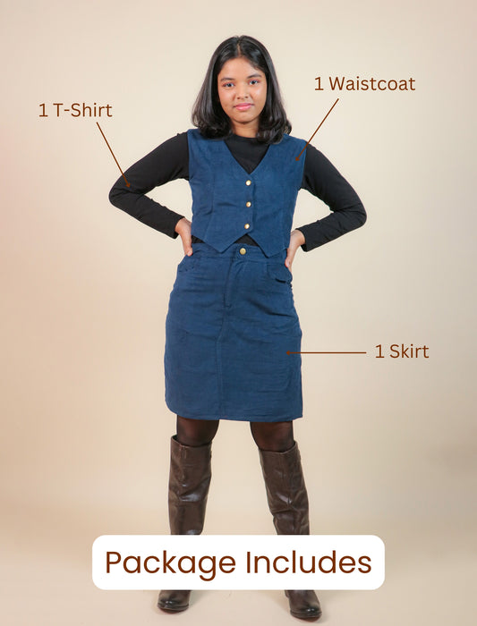Cordy Chic Winter Combo Set of Waistcoat, Skirt & T-shirt for Girls Kids (Blue)