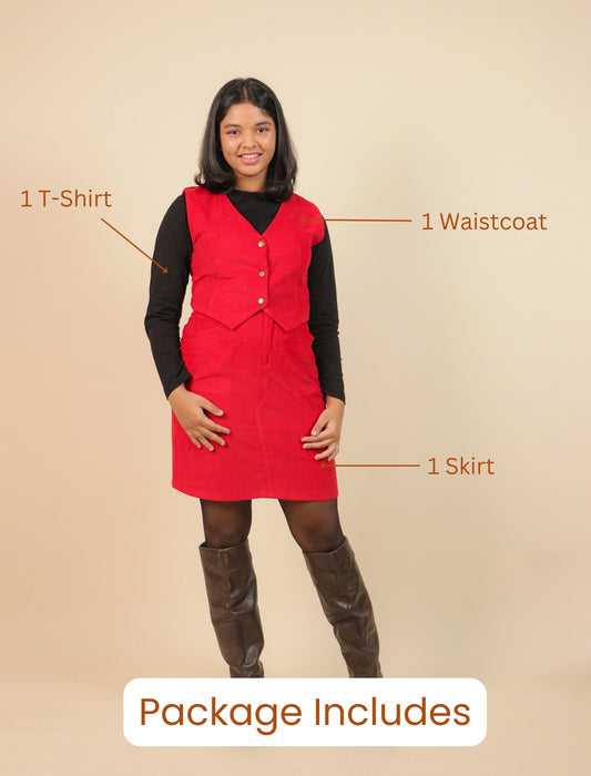Cordy Chic Winter Clothing Set of Waistcoat, Skirt & T-shirt for Girls Kids (Red)