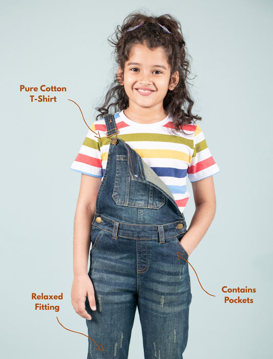 Girls Kids Denim Dungaree Set with Half Sleeve T-Shirt Combo (Dark Blue)