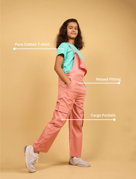 Cargo Twill Cotton Dungaree for Kids Girls with Half Sleeve T-Shirt (Peach)