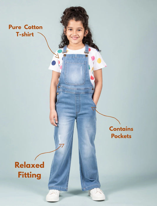 Denim Dungaree for Girls with Half Sleeves T'shirt (Light Blue)