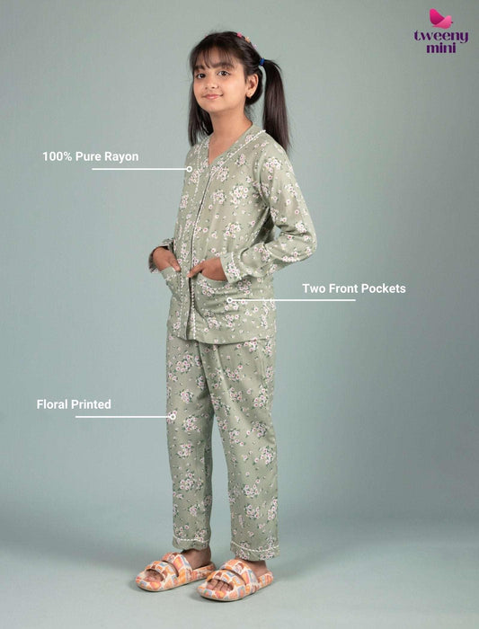 Pure Rayon Floral Nightsuit for Girls Kids (Full Sleeves, Green)