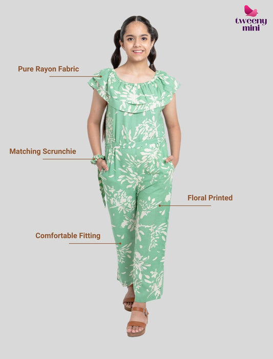 Off-Shoulder Floral Printed Summer Jumpsuit for Girls Kids (Light Green)