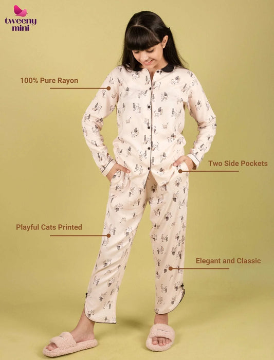 Playful Cat Printed Girls Nightsuit with Pyjama Set (Full Sleeves, Cream)
