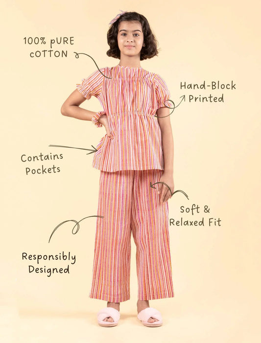 Pure Cotton Handblock Print Night Suit For Kids Girls (Rose Red)