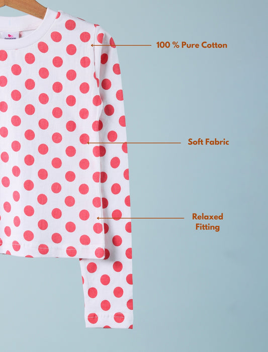 Hand Printed Pure Cotton Full Sleeve T-Shirt for Girls Kids (Red Polka Dot)