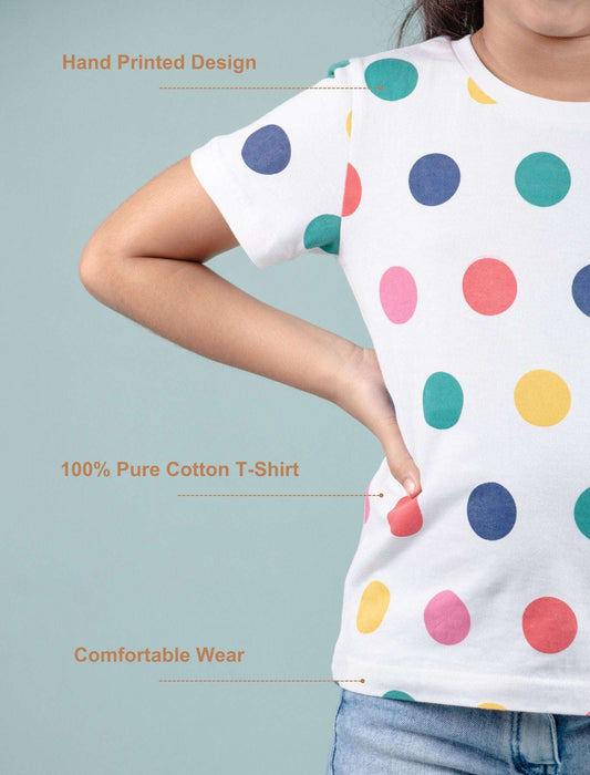 Hand Printed Pure Cotton T-Shirt for Girls Kids (Multi Polka Dot)