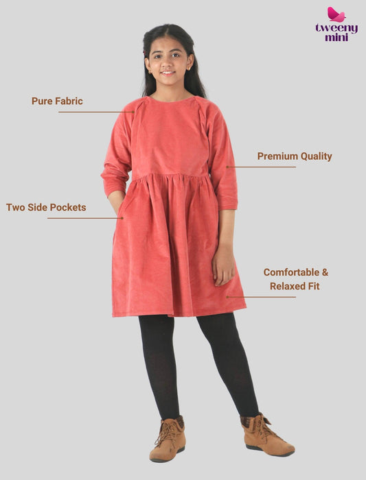Girls Kids Full Sleeve Winter Corduroy Dress (Rust)