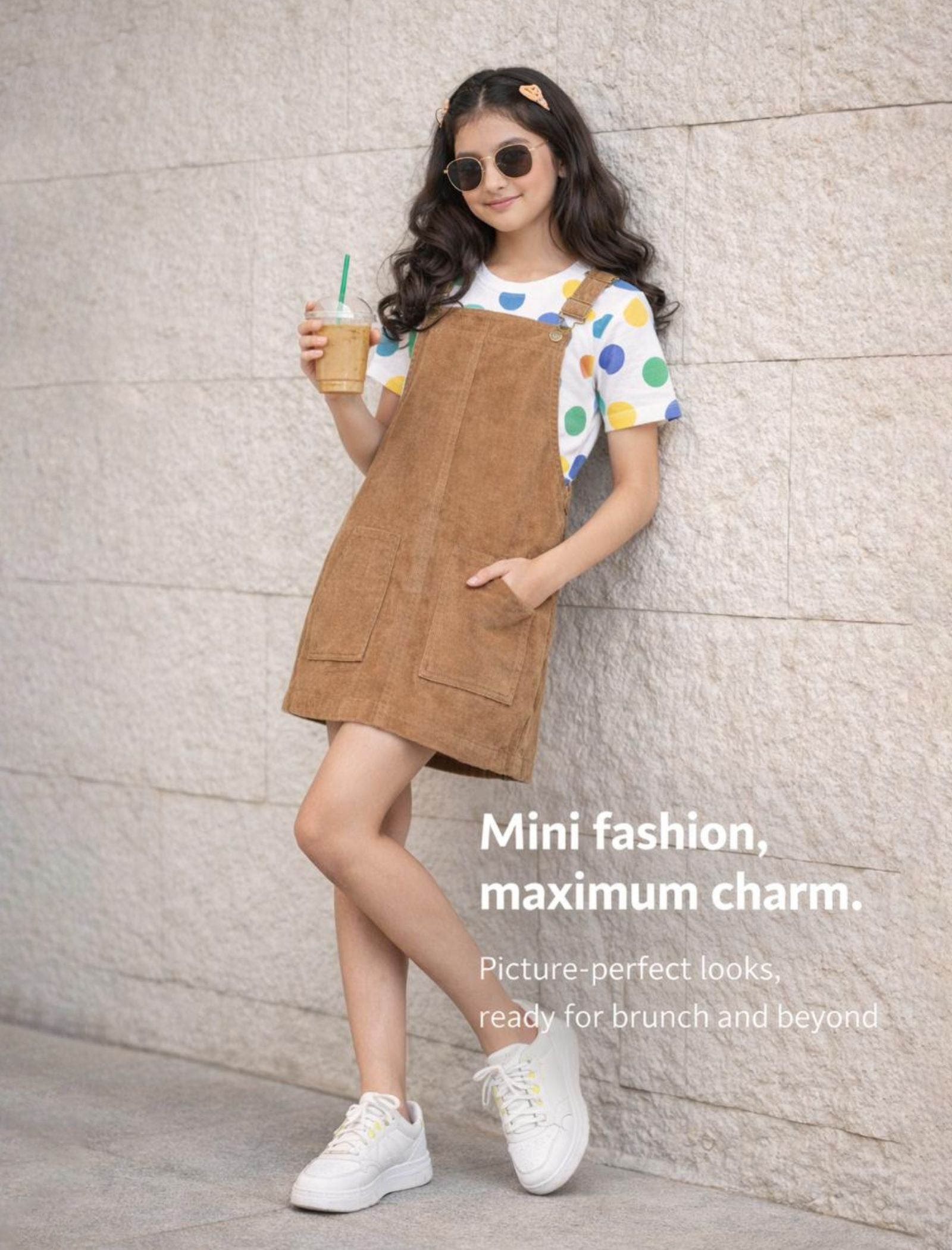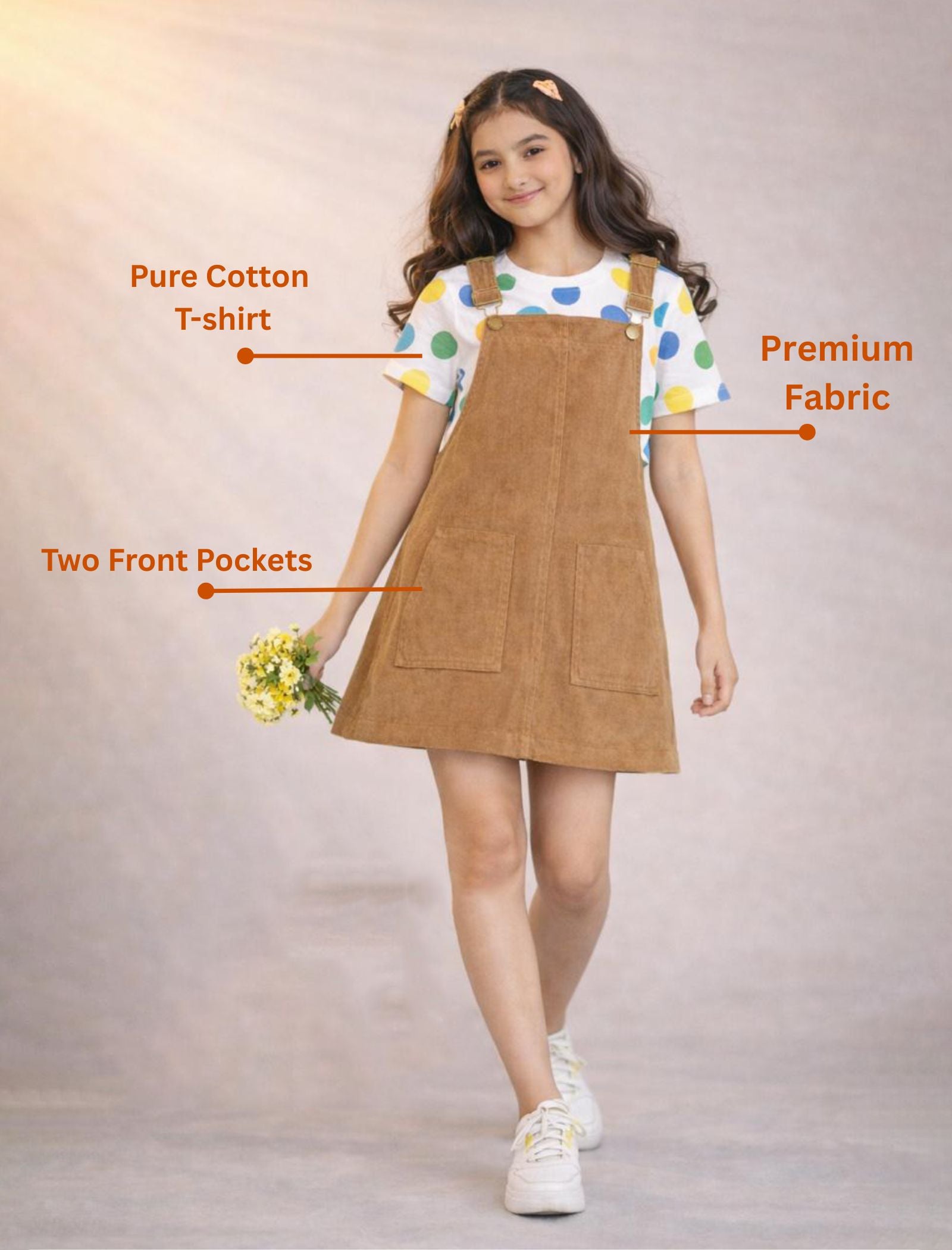 This outfit combines a structured corduroy pinafore with a soft half sleeve cotton T-shirt, creating a coordinated look that feels both classic and modern. The layered design allows the outfit to work well across different seasons and occasions. Whether worn to school, family outings, birthday celebrations, or casual gatherings, the girls kids pinafore dress offers a charming style that remains comfortable from morning to evening.