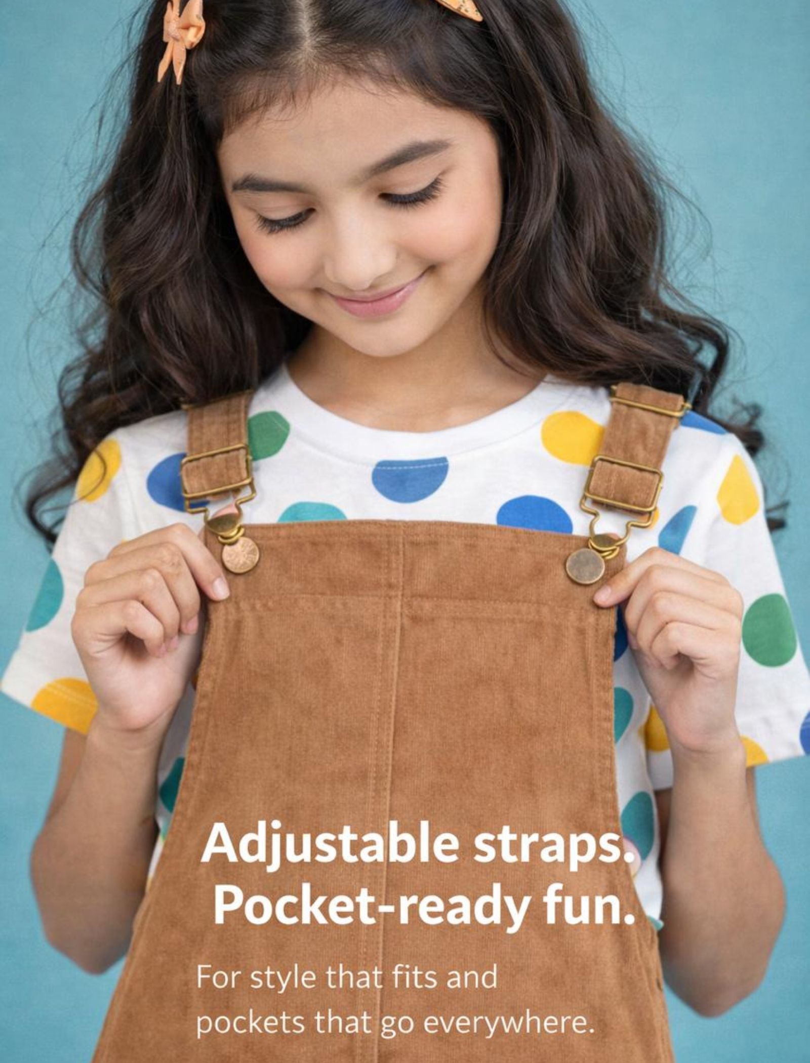 Fabric quality plays an important role in children’s clothing, especially when outfits are worn for many hours during school or outdoor activities. This thoughtfully designed girls kids pinafore dress is crafted using premium corduroy fabric paired with a soft cotton T-shirt to ensure long-lasting comfort and durability.