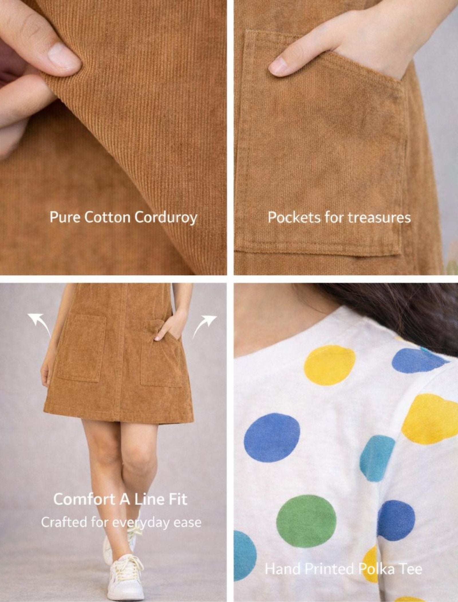 The pinafore dress offers the perfect blend of comfort, durability, and timeless design. The premium corduroy fabric, adjustable straps, and soft cotton T-shirt create an outfit that works beautifully for everyday wear as well as special occasions.