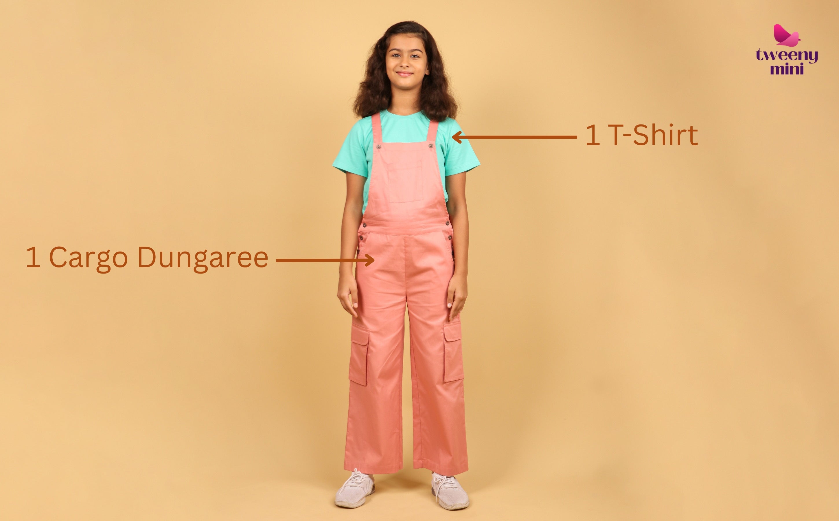 Cargo Twill Cotton Dungaree for Kids Girls with Half Sleeve T-Shirt (Peach)