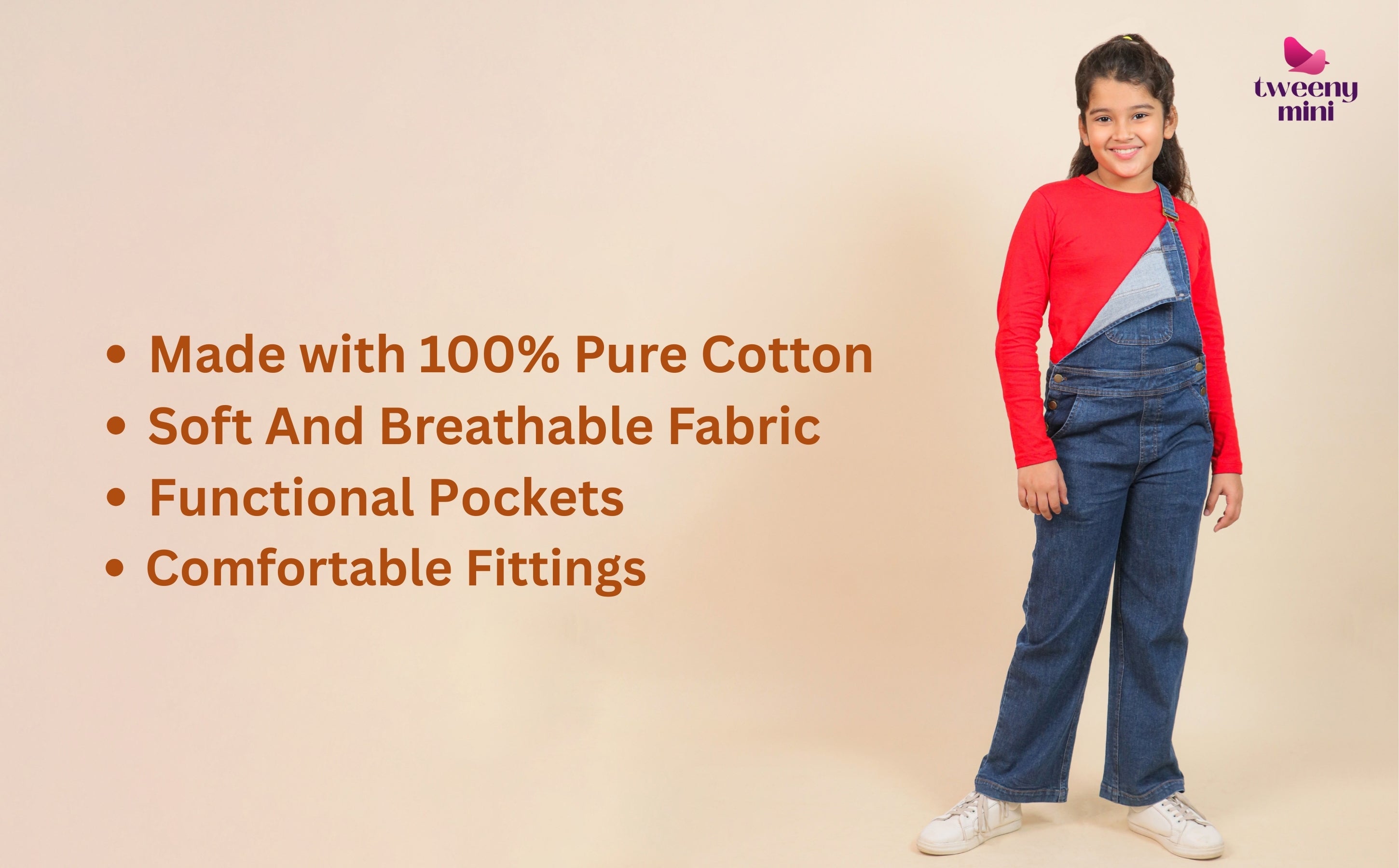 This makes it an ideal cotton denim dungaree for girls who need both comfort and durability in their daily outfits.