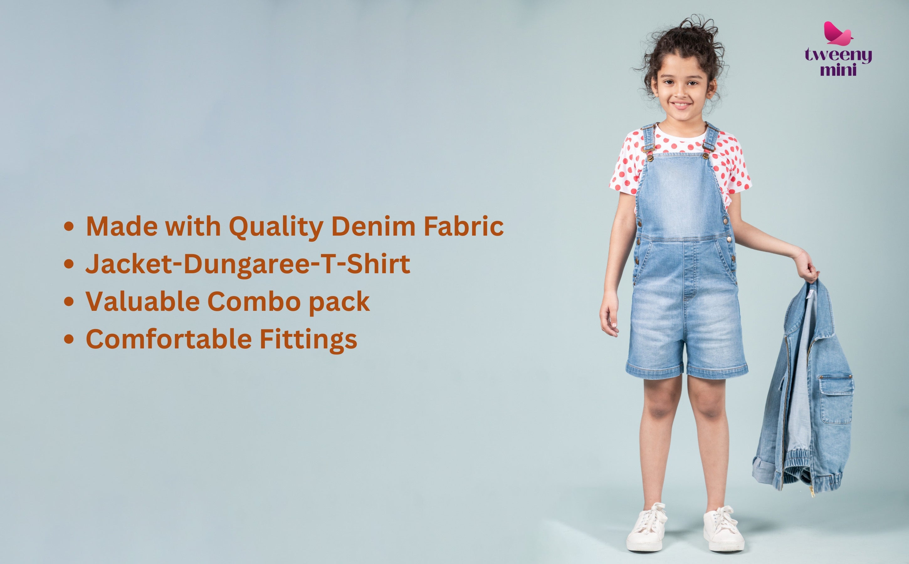 ensure comfort and functionality. Kids can run, climb, bend, and explore freely in this thoughtfully engineered girls denim dungaree combo.