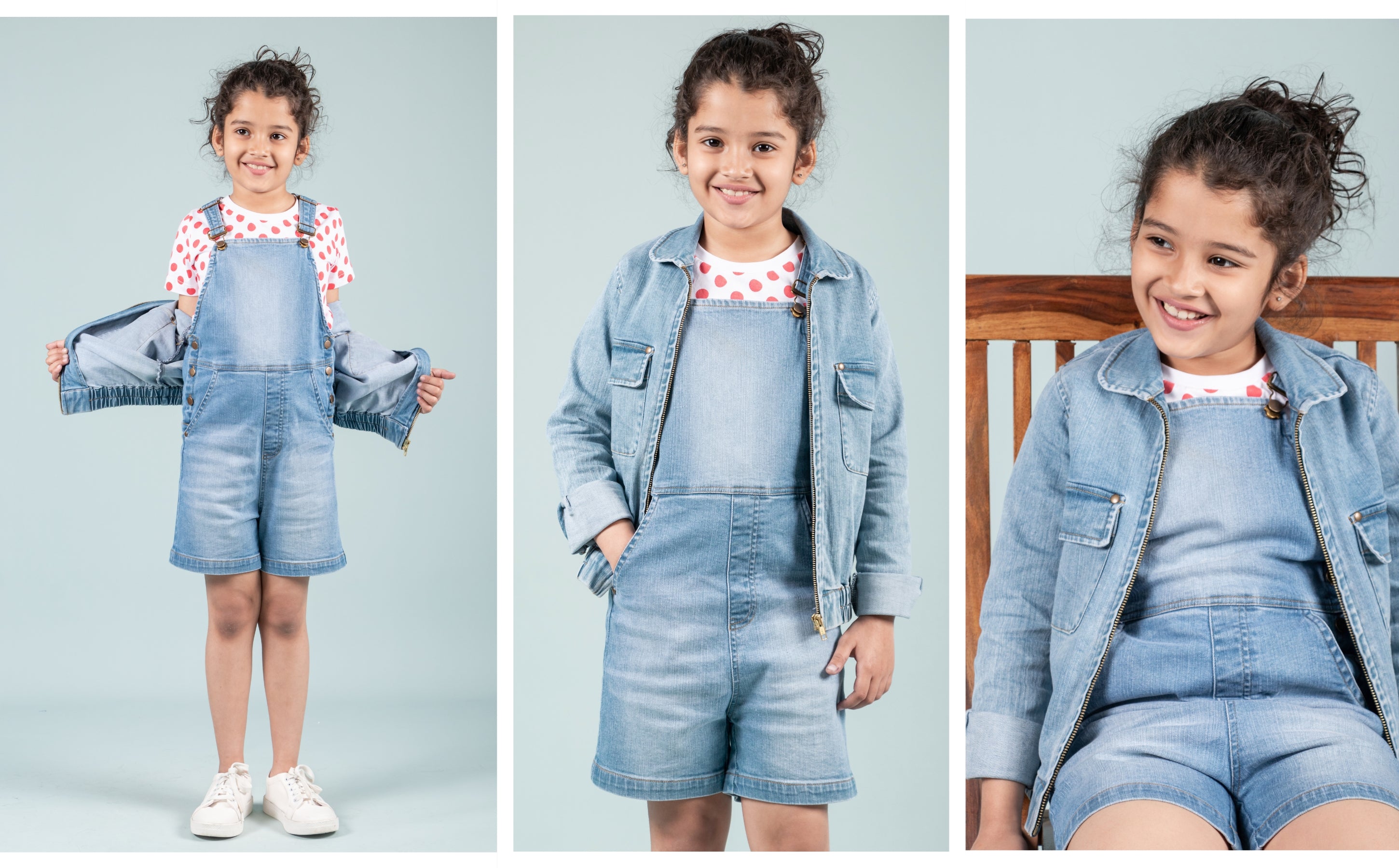 The denim jacket delivers structure without stiffness. The dungaree, made from the same cotton denim fabric, offers complete flexibility. Each piece is lightweight enough for summer and sturdy enough for slightly cooler months.