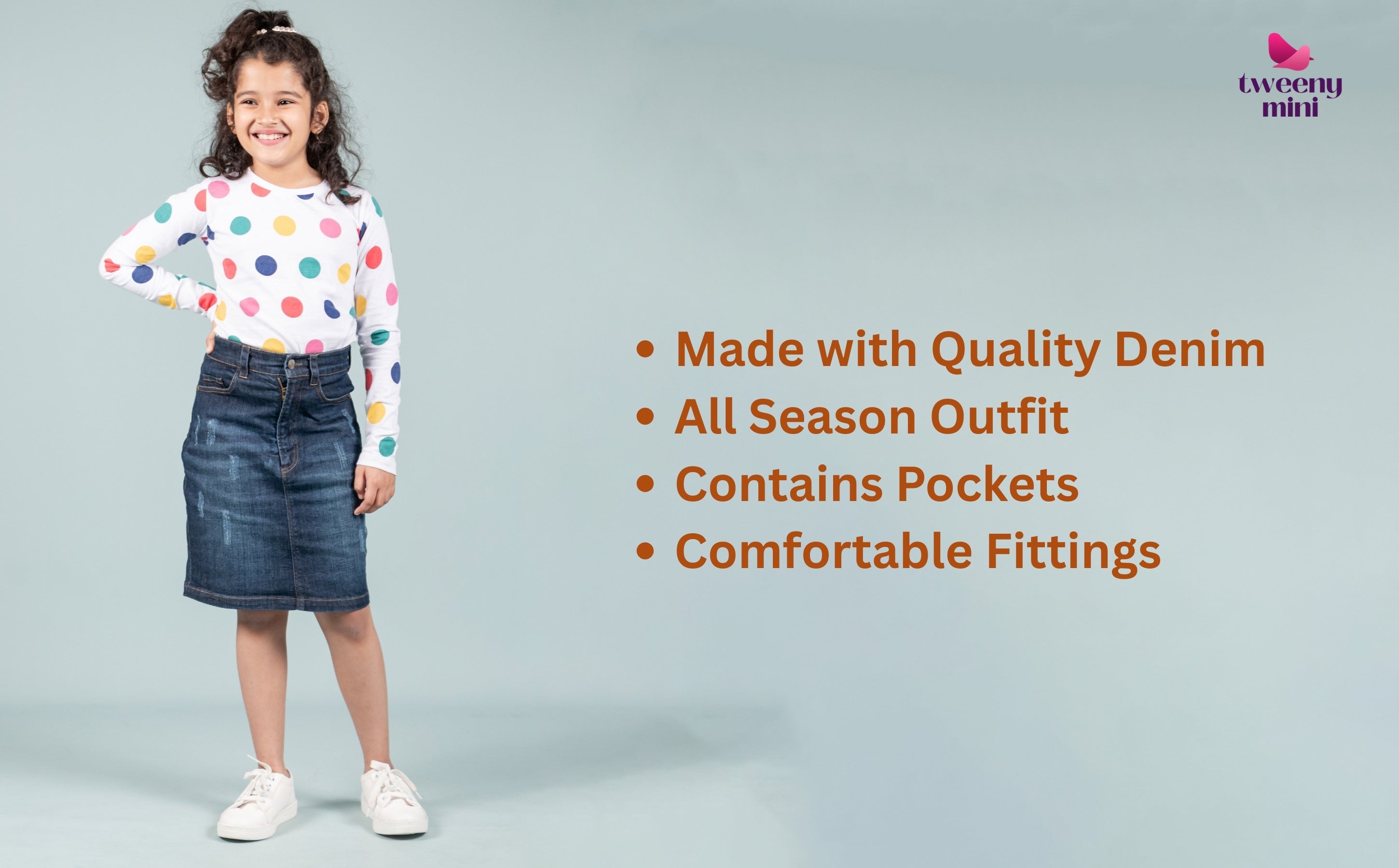 A mild distressed wash enhances the modern appeal, giving it the perfect mix of casual coolness and sophisticated charm. This makes it a top pick among parents looking for stylish skirt for girls outfits for outings, birthdays, and school days.