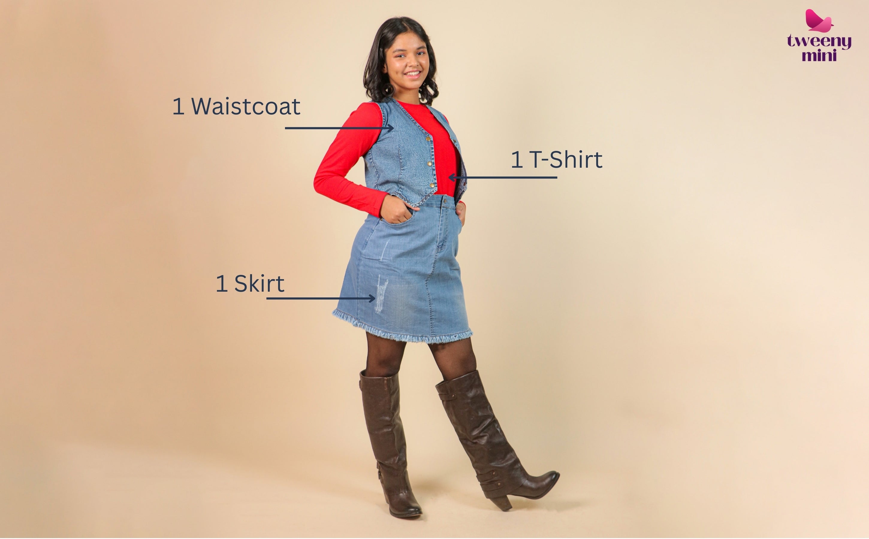The structured waistcoat, relaxed skirt, and soft T-shirt work together to create an outfit that feels comfortable yet refined—perfect for growing girls developing their personal style.