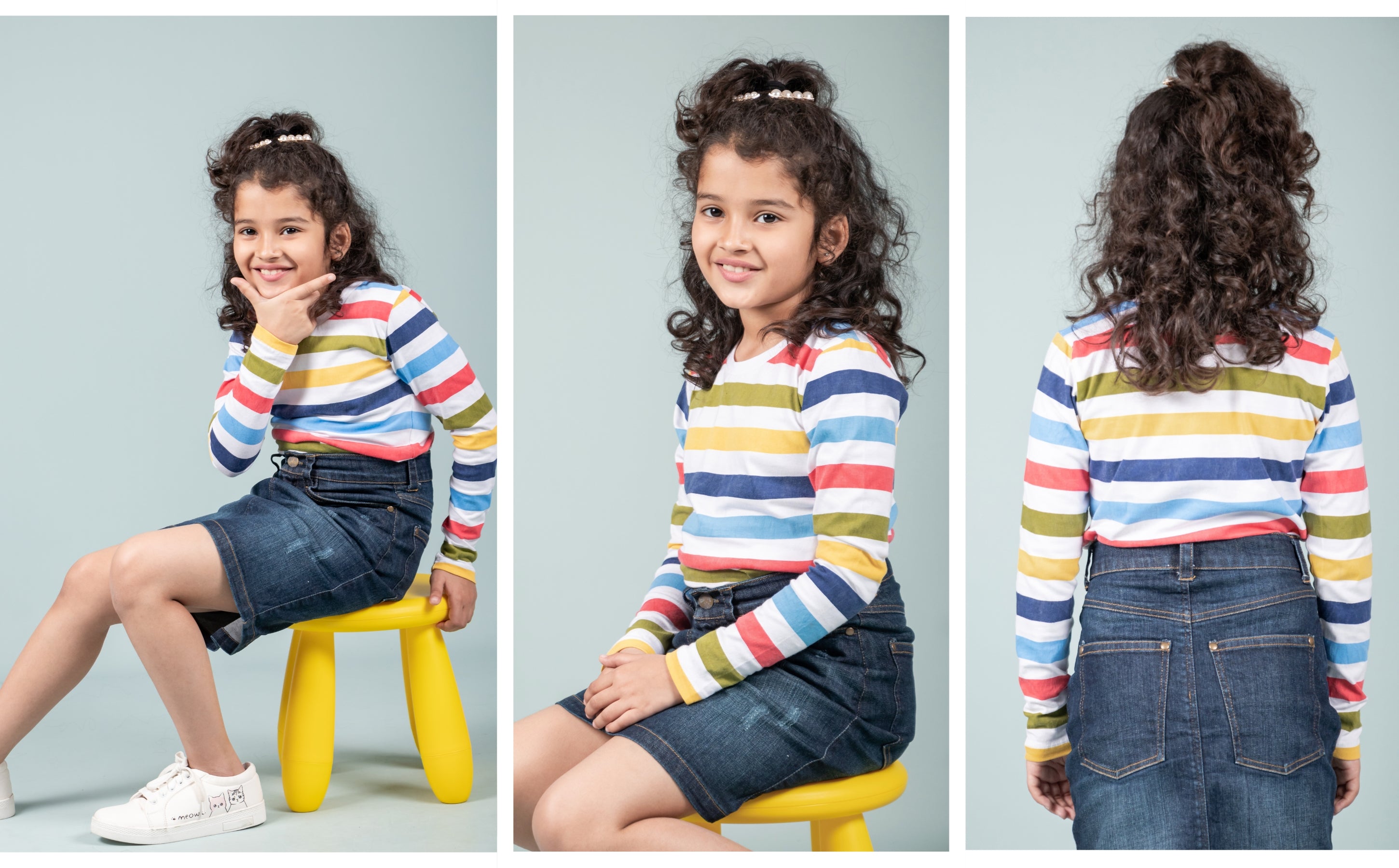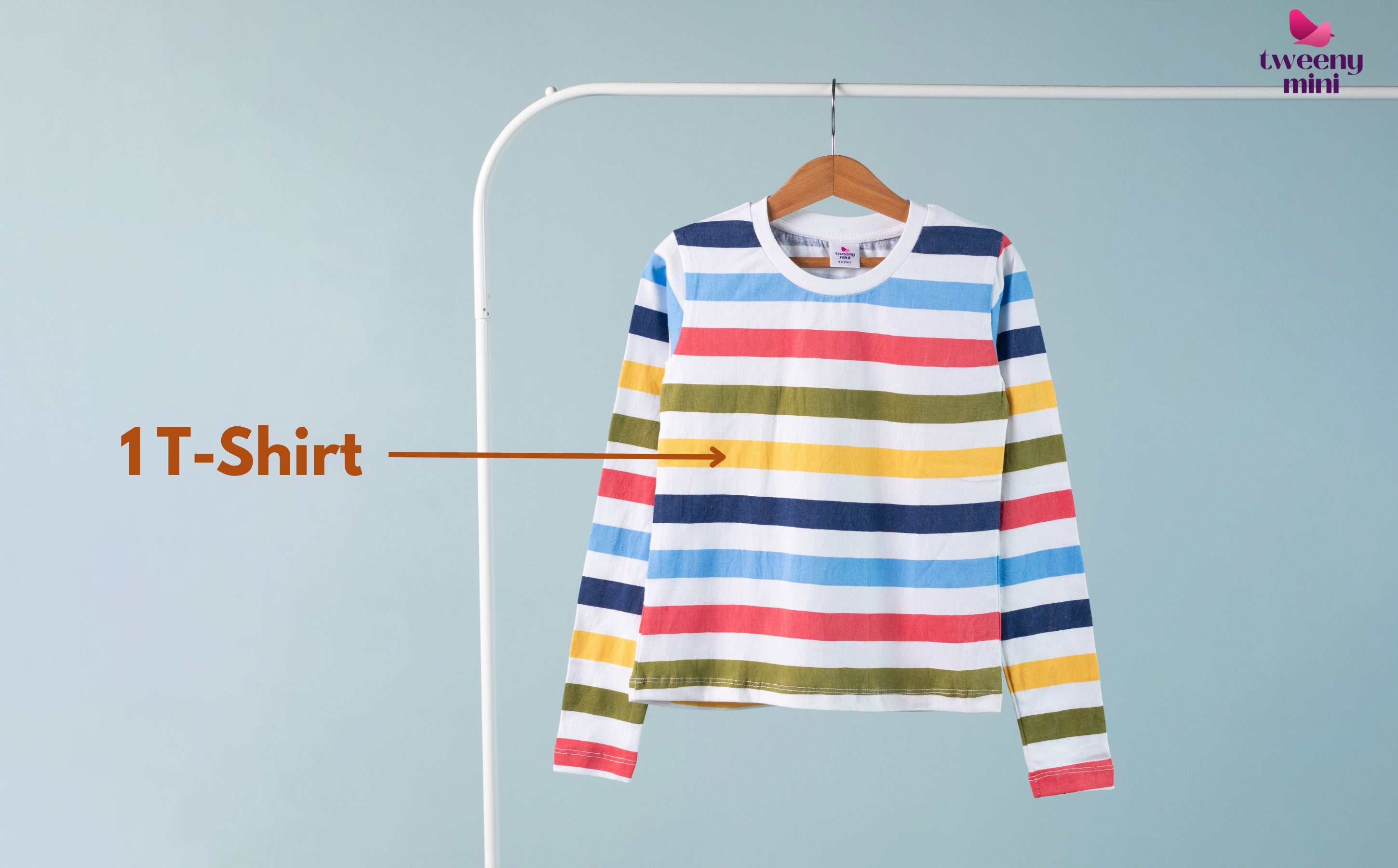 Parents looking for a girls striped full sleeve t-shirt will appreciate the vibrant style and premium finish that stands out without being too bold. The stripes shift between warm and cool tones, creating a balanced and joyful look suitable for school days, photoshoots, and casual outings.