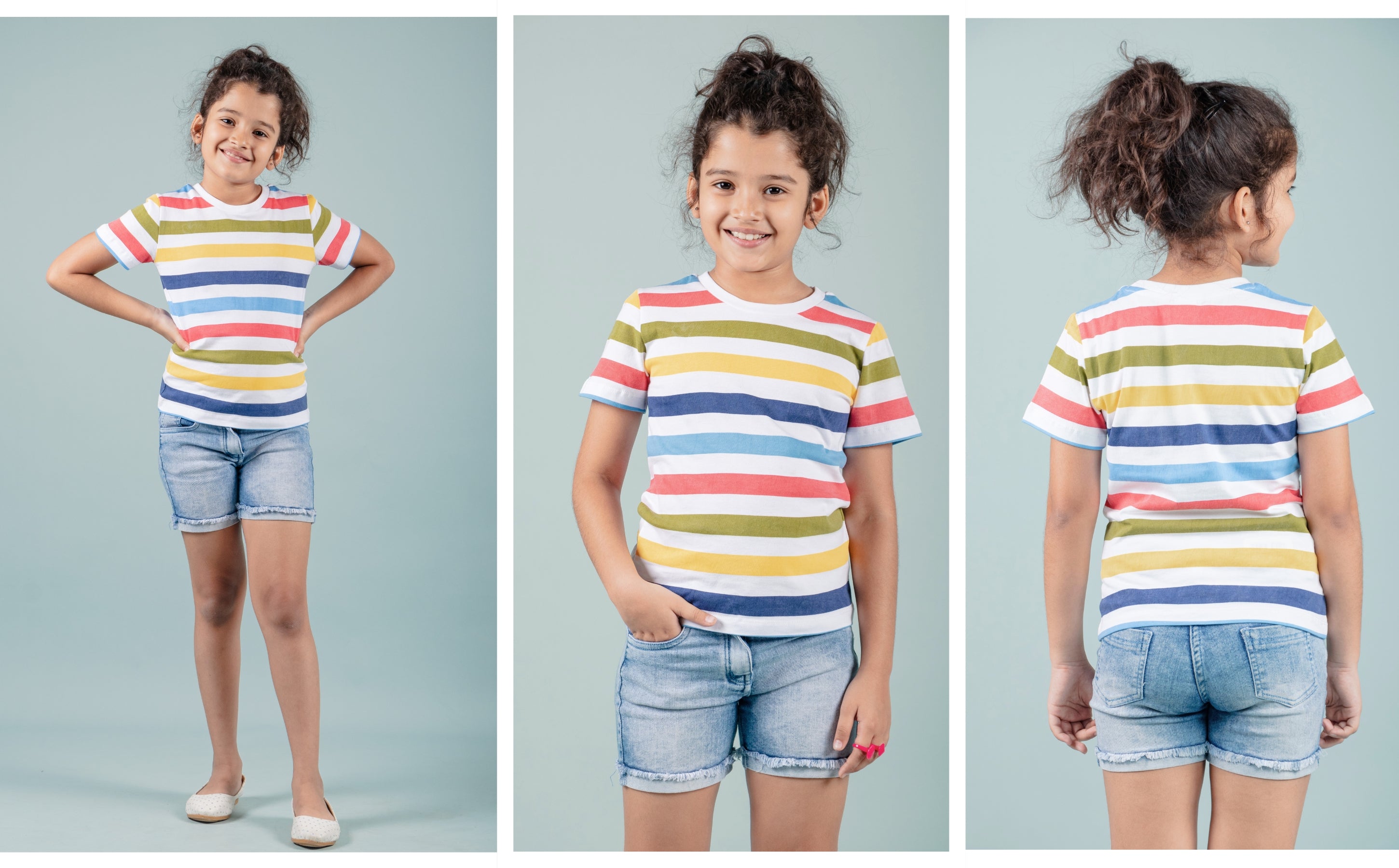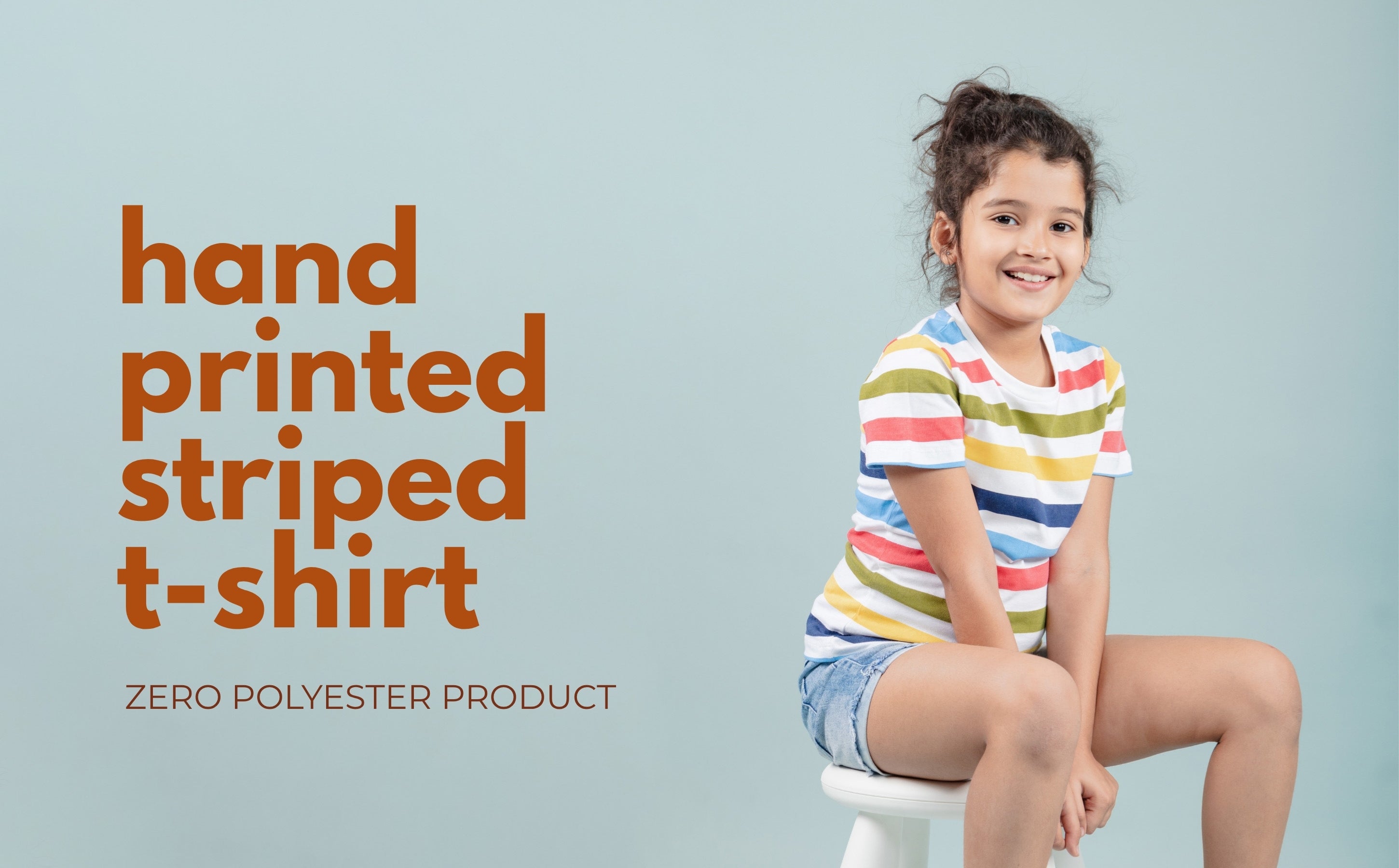 This tee stands apart from machine-made clothing because each piece is hand-printed by skilled artisans. The multi-stripe pattern is vibrant, cheerful, and perfect for kids who love colorful outfits.