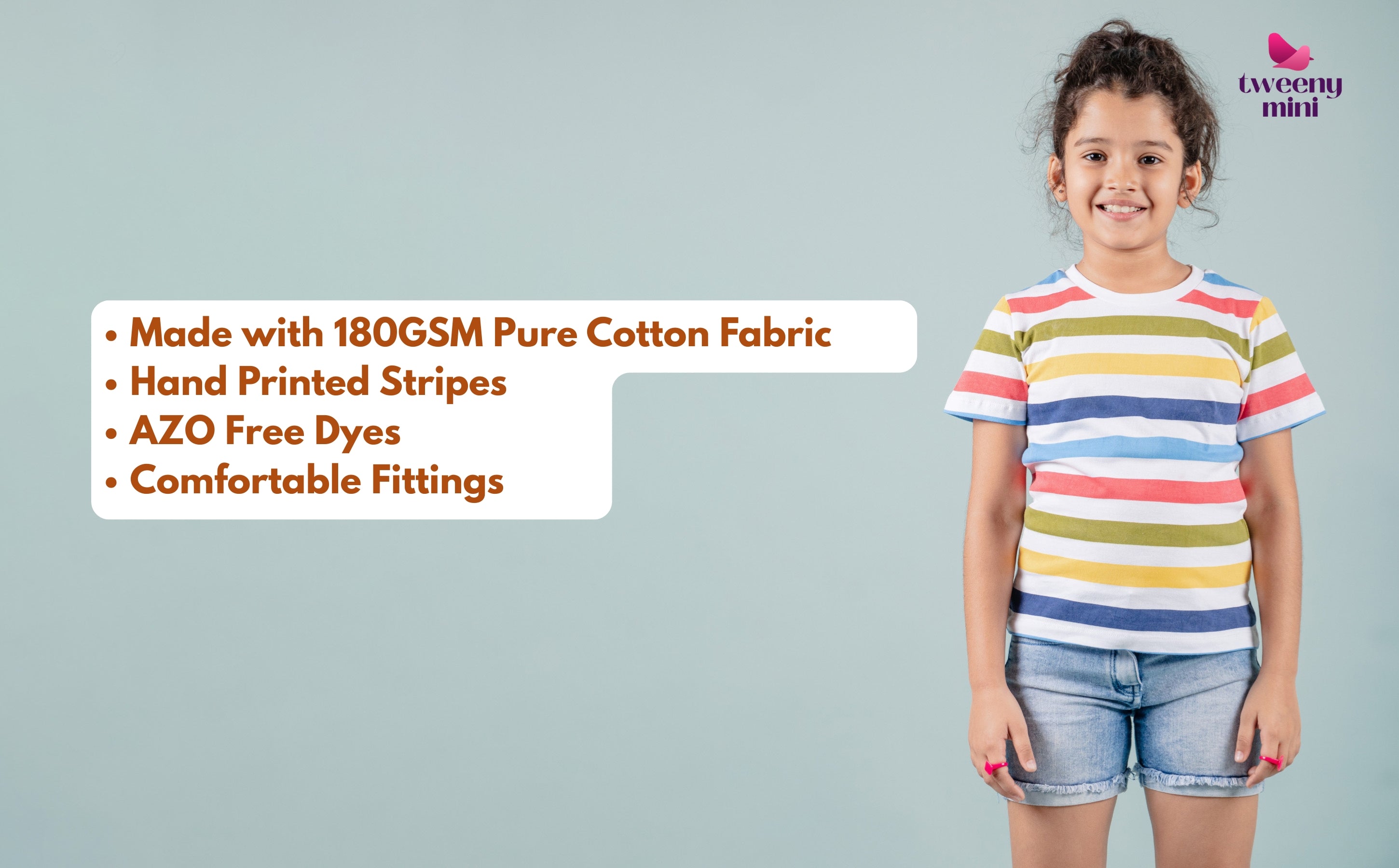 This isn’t just another summer top. It’s a high-quality, breathable, and ultra-comfortable tee made from 180 GSM pure cotton — gentle on delicate skin, safe for kids with sensitivities, and durable enough to keep up with their active days. Featuring multi-colored, hand-printed stripes, this pure cotton t-shirt for girls is a combination of traditional craftsmanship and modern style.