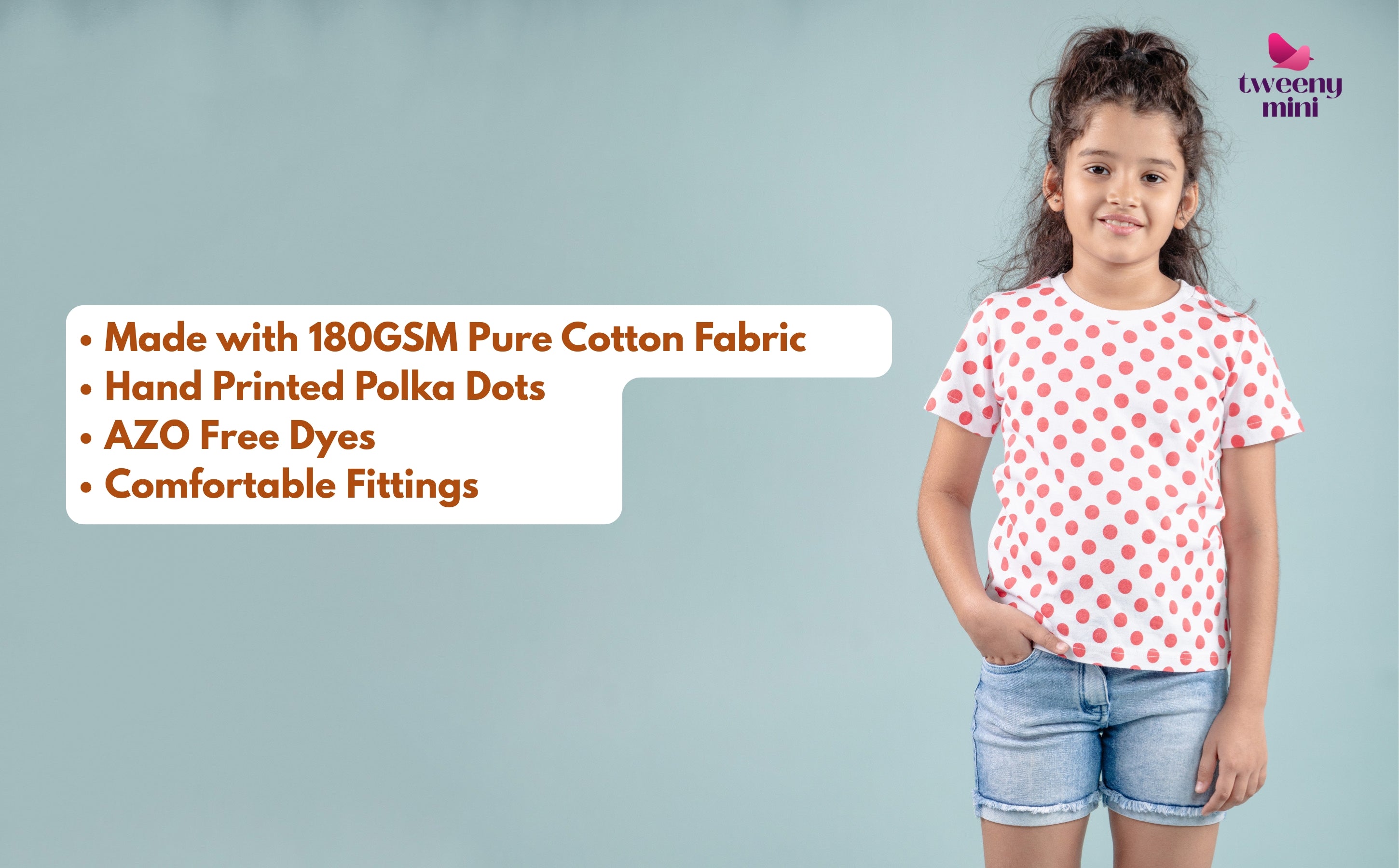 Hand-Printed Pure Cotton Half Sleeve T-Shirt for Girls (Red Polka Dot)