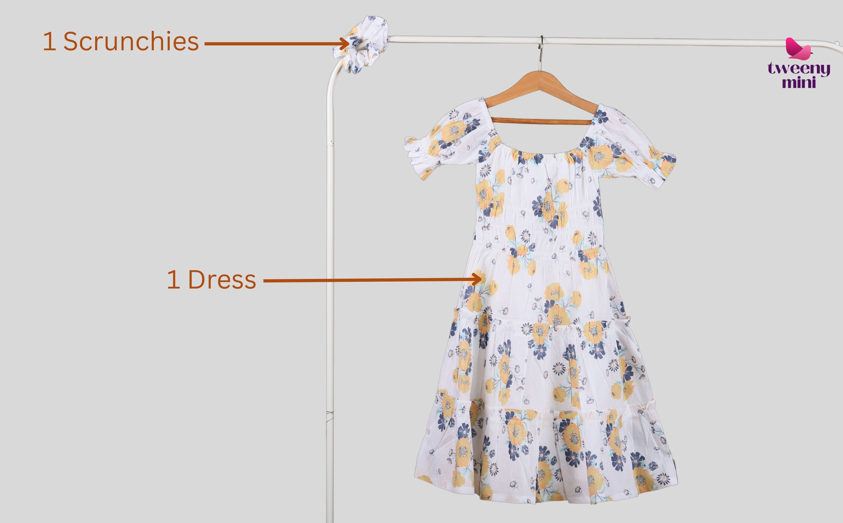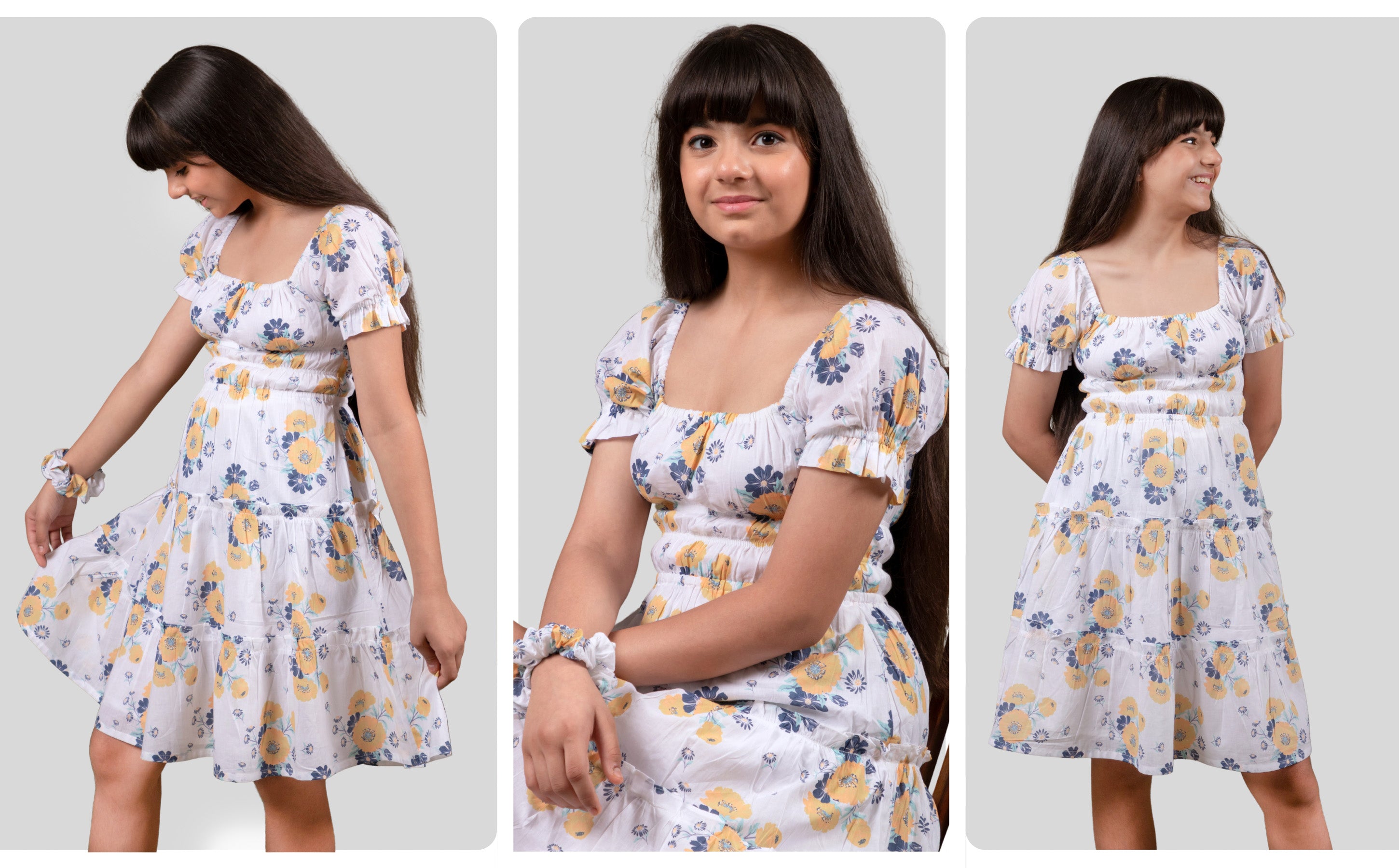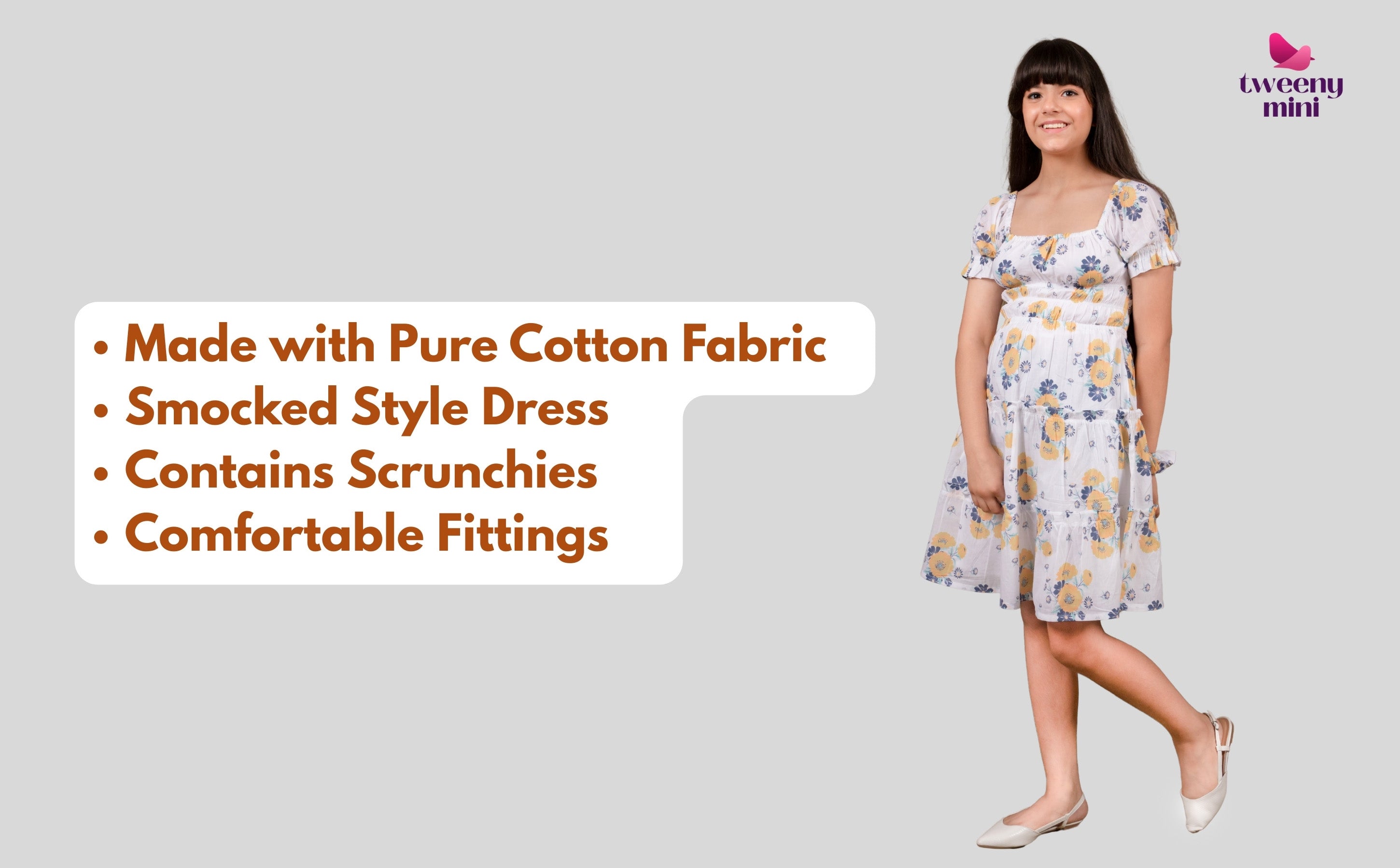 The floral patterns on this Smocked Floral Dress are digitally printed using high-quality, skin-safe dyes. The yellow and blue floral motifs are thoughtfully arranged to complement the white base fabric, resulting in a refreshing, crisp look suitable for both everyday use and celebrations.