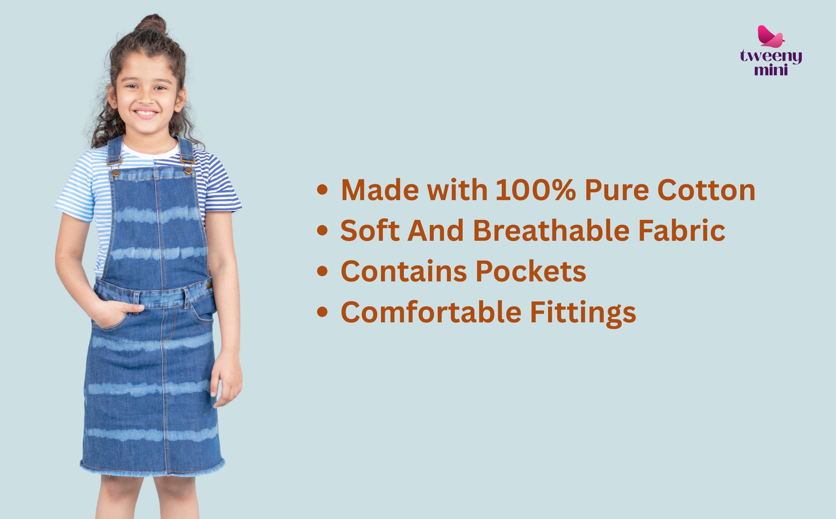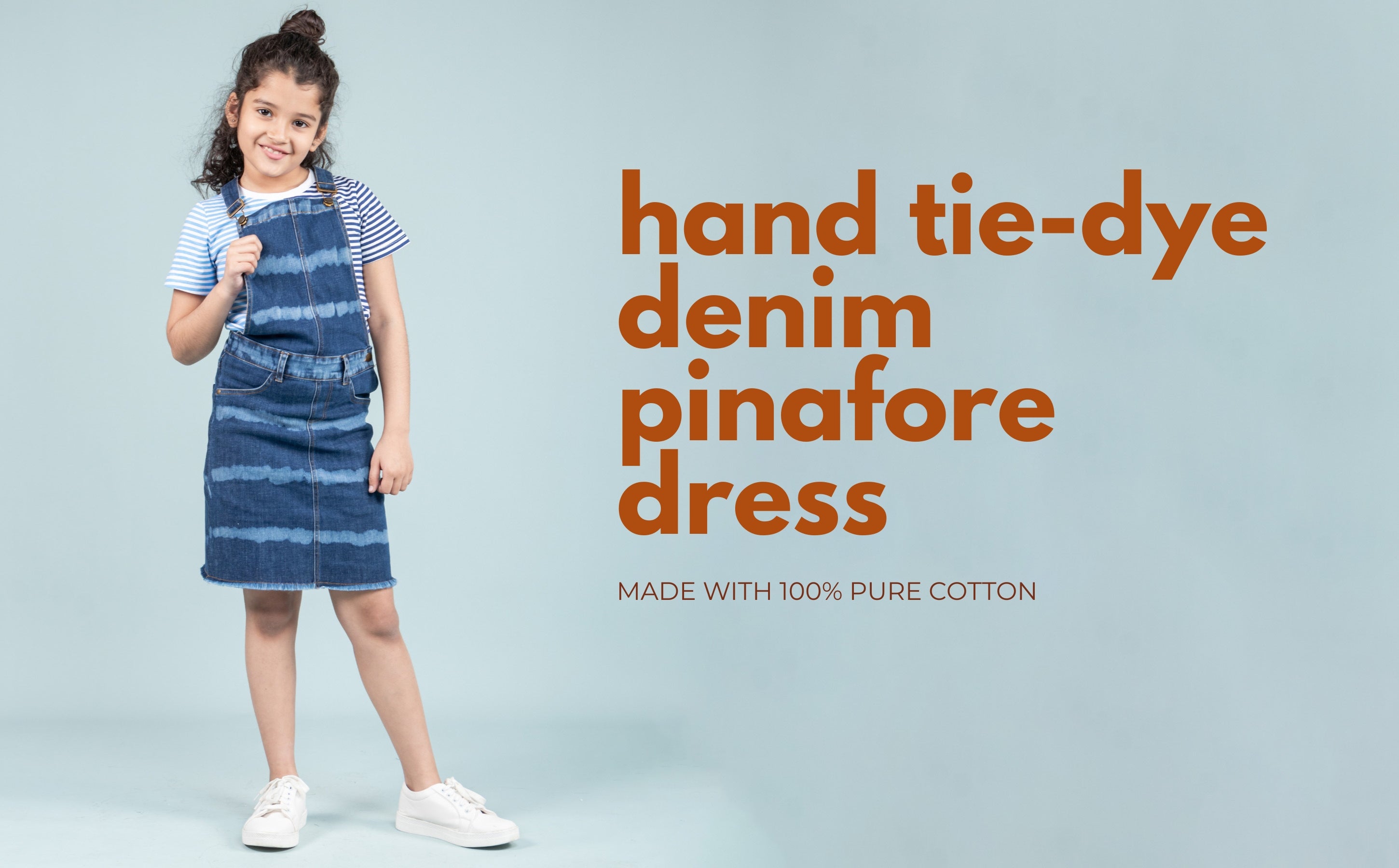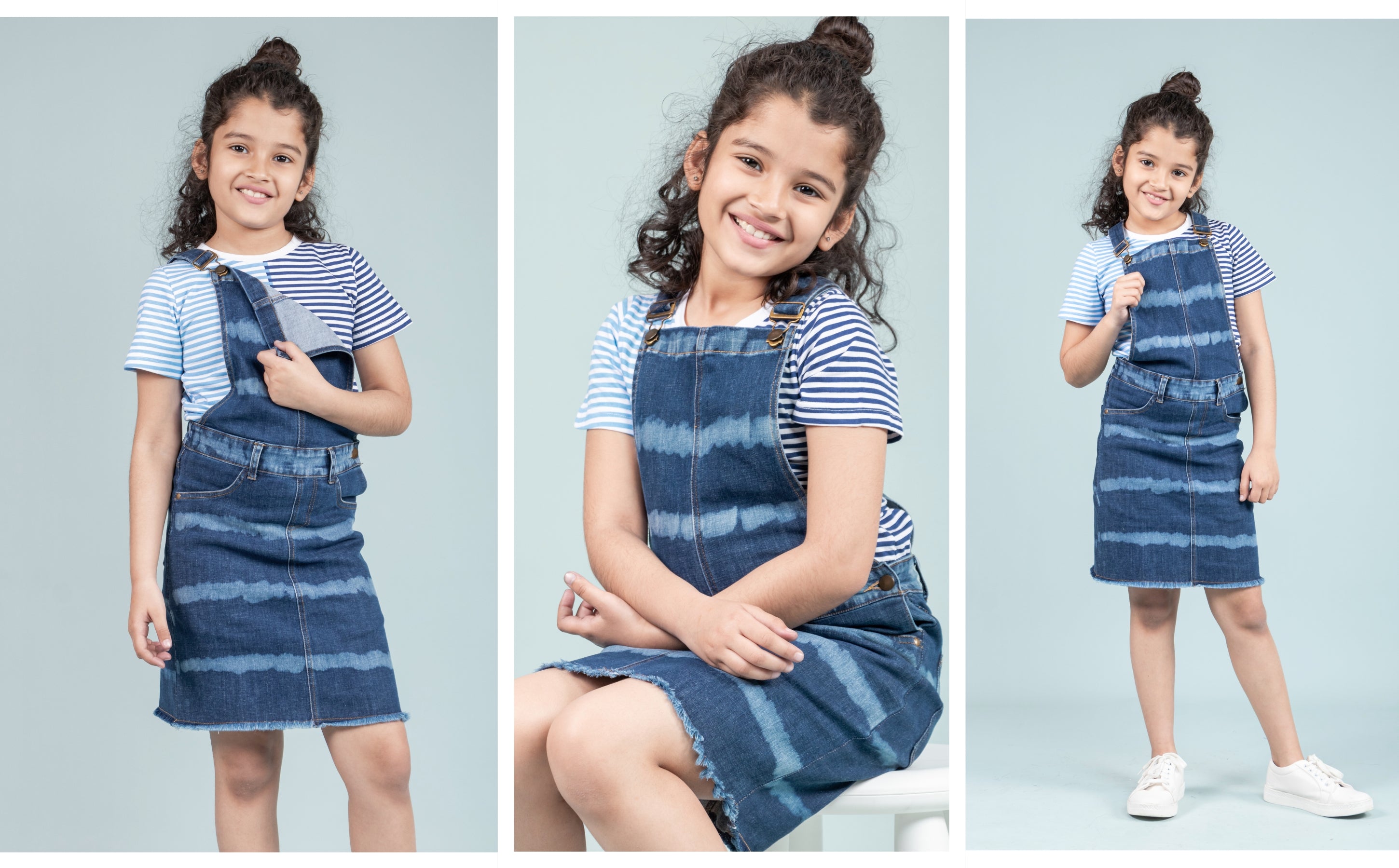 This beautifully crafted dungaree dress paired with a striped tie-dye T-shirt brings together tradition, trend, and exceptional comfort. It’s playful enough for childhood adventures and stylish enough for any occasion. With its breathable cotton denim, thoughtful structure, and cheerful colours, it’s bound to become a go-to favourite.