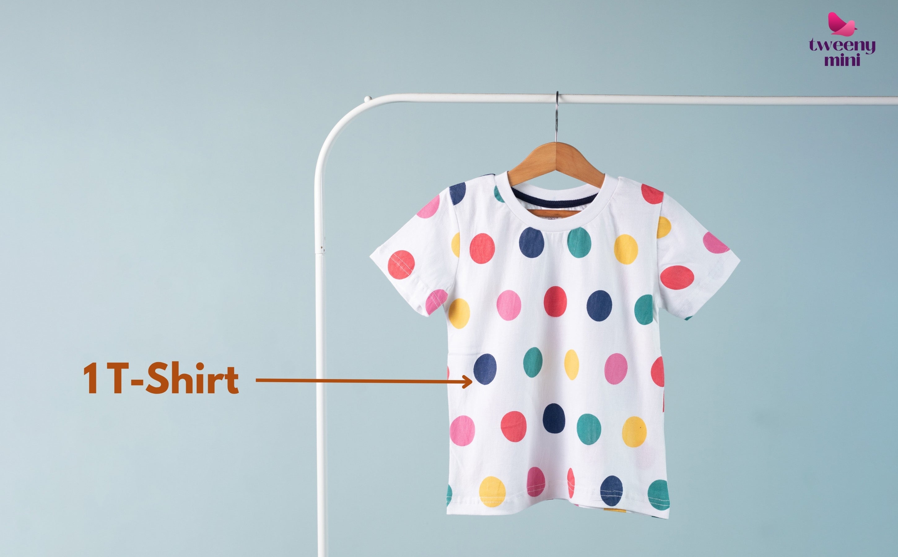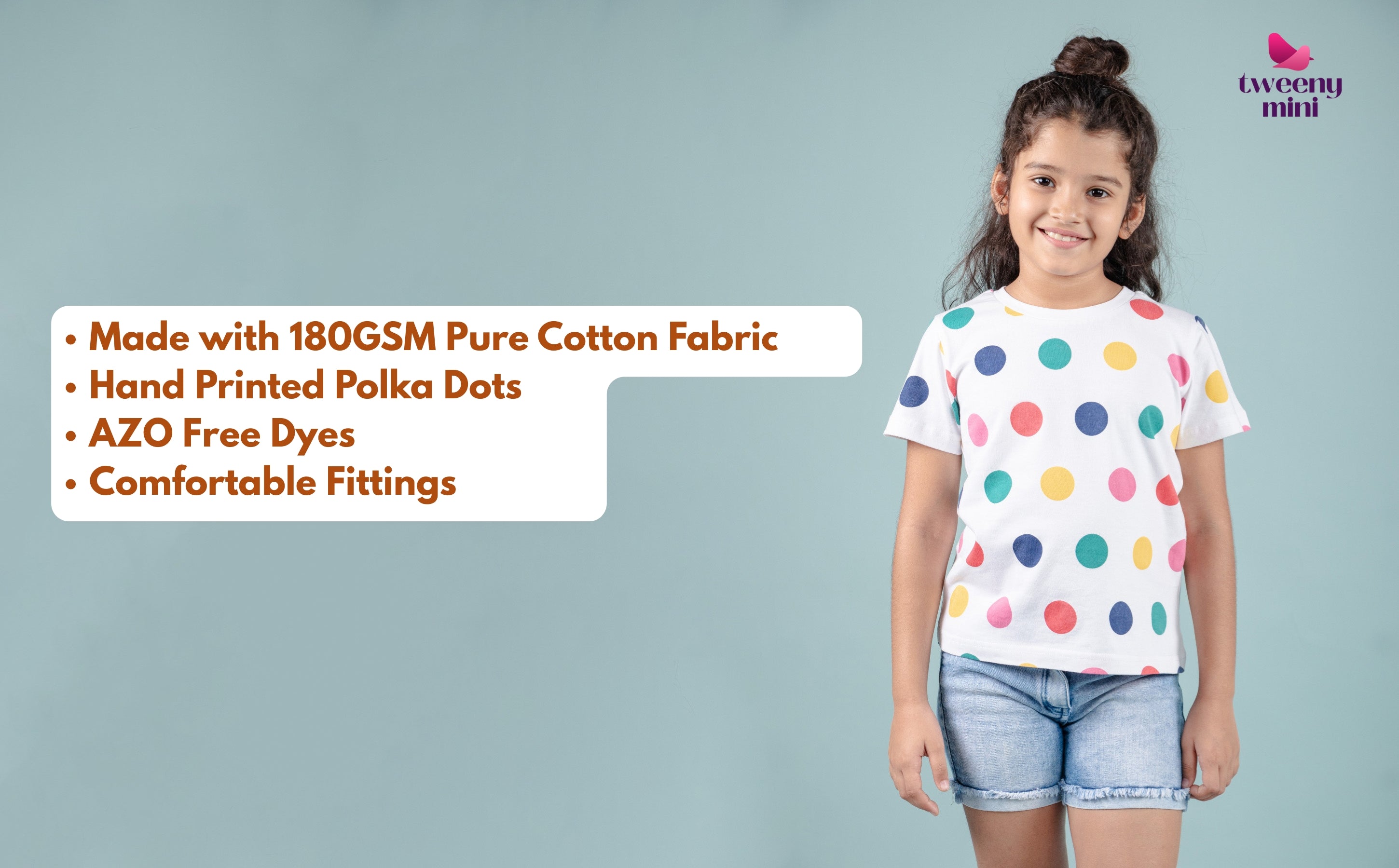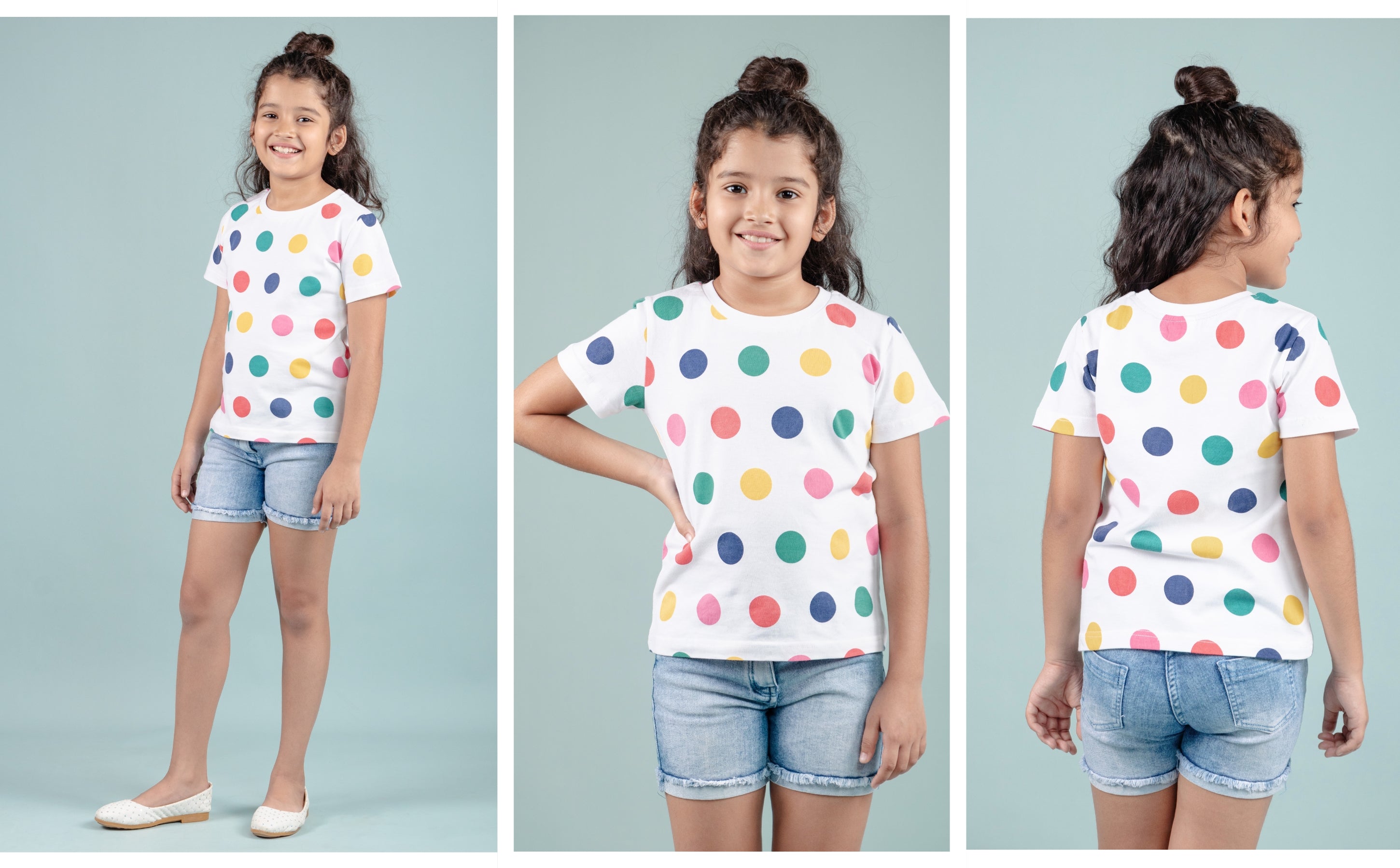 Choosing the right everyday wear for your child can transform her entire day. Whether she is heading to school, meeting friends, exploring outdoors, or simply playing at home, comfort is always the top priority. Our half sleeve cotton t-shirt for girls is thoughtfully crafted to meet the needs of active, energetic, and style-loving kids. With its soft fabric, breathable structure, and charming multi–colour polka dot pattern, it brings together everything parents and children value most in daily wear—comfort, durability, and cuteness.