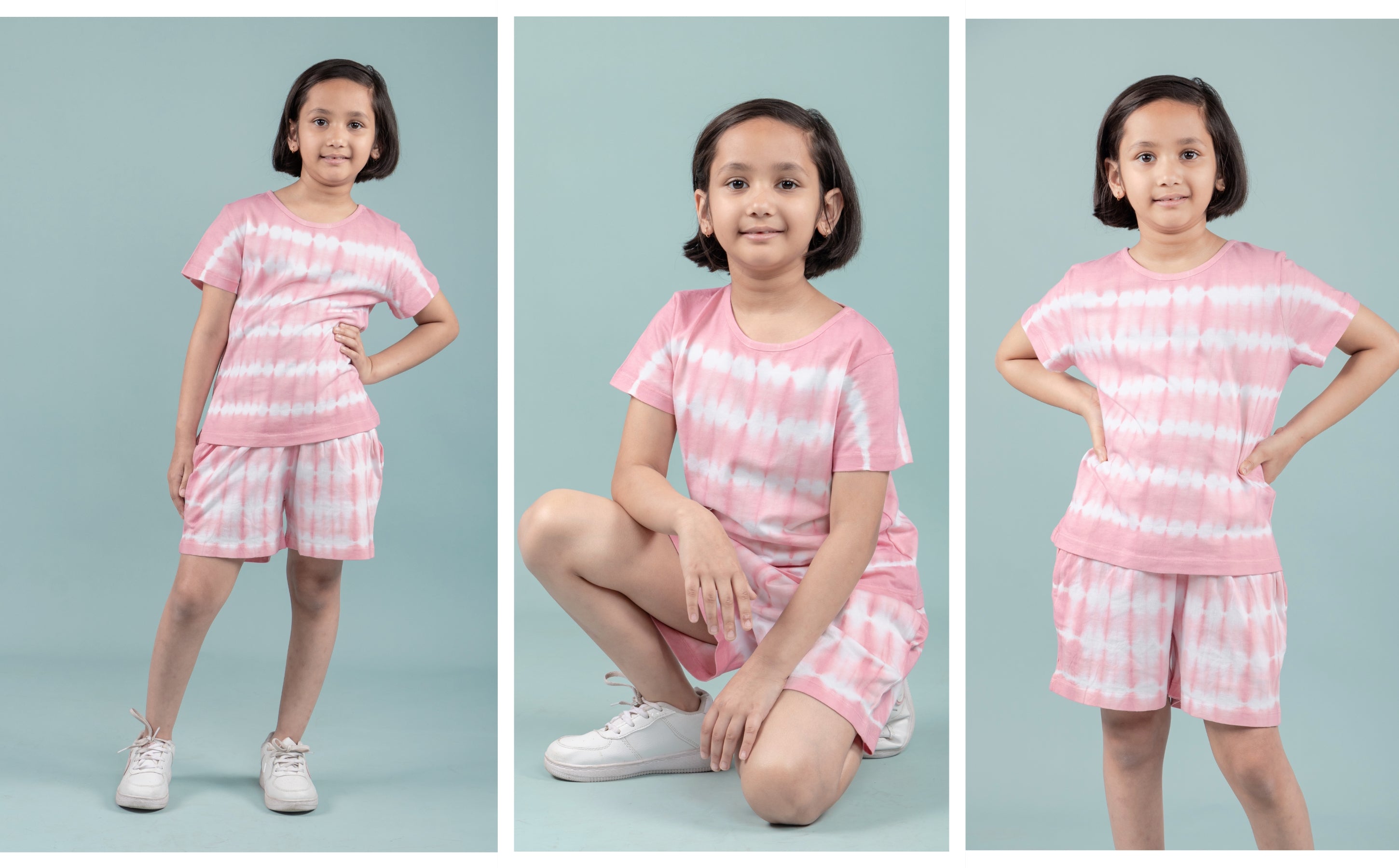 This tie-dye co-ord set kids style brings a fresh, cheerful vibe. The soft pink shades blend beautifully to give the outfit a dreamy summer feel, perfect for outdoor play, casual outings, or relaxing evenings.