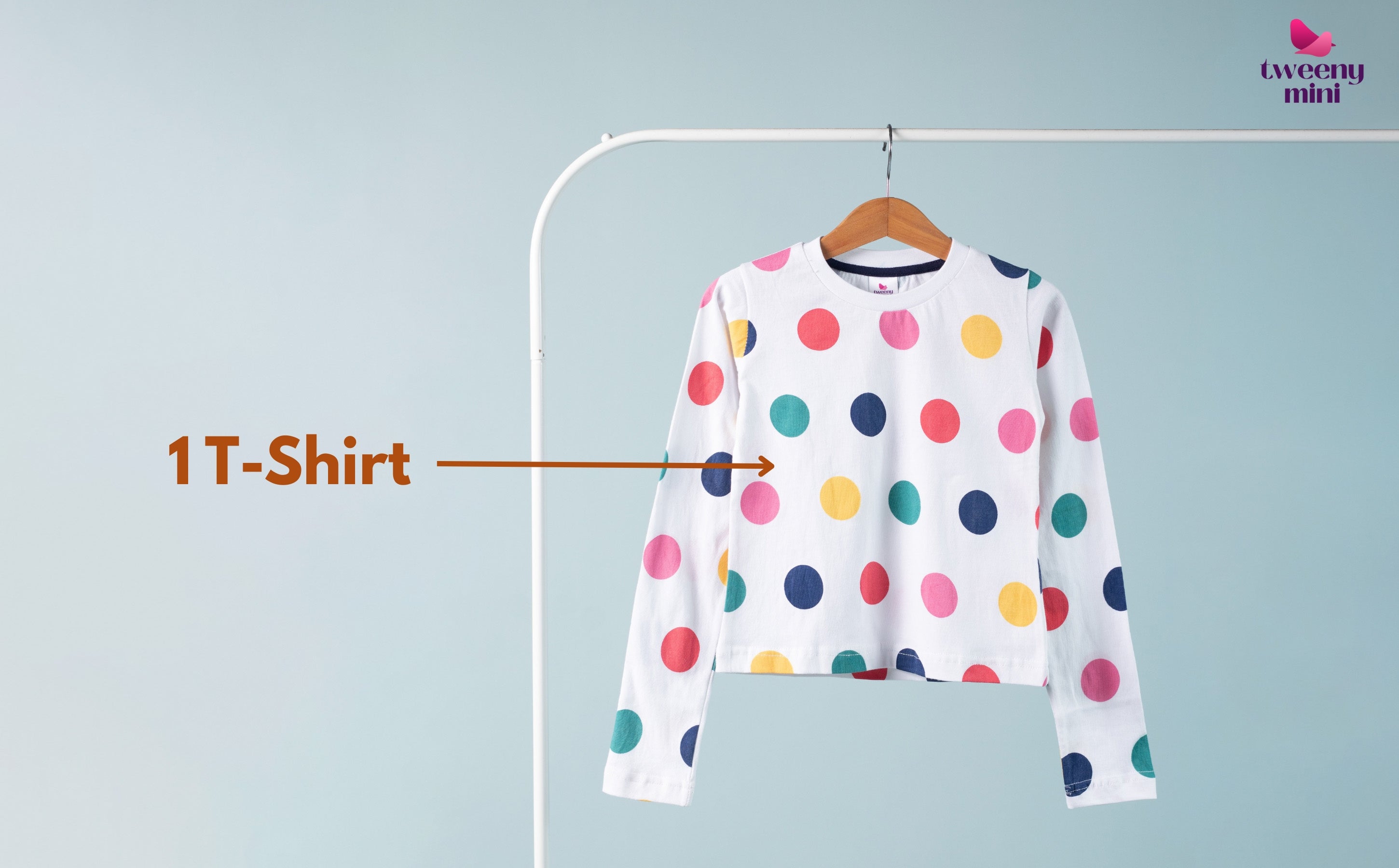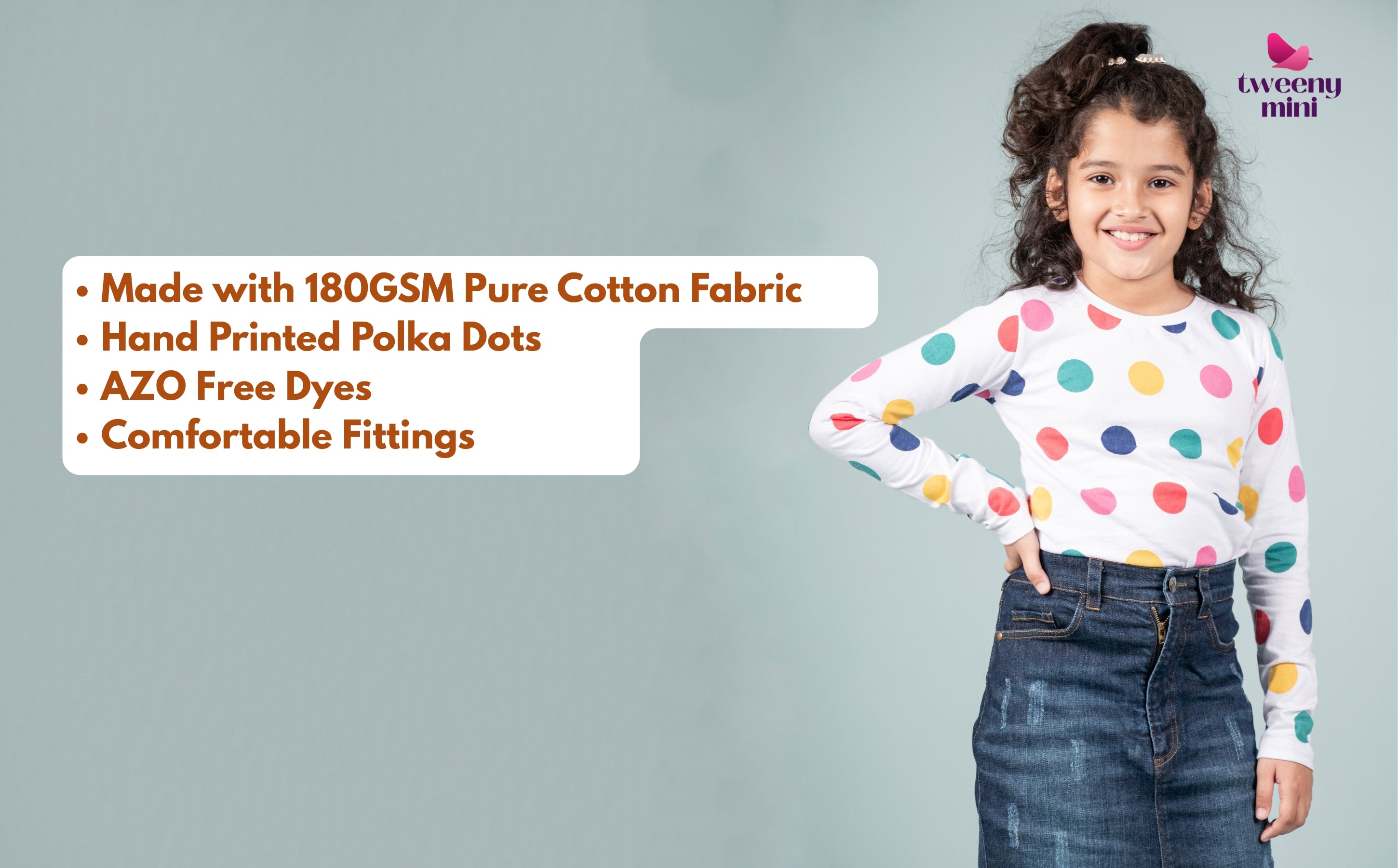 When it comes to choosing daily wear for your child, comfort and quality come first. Our cotton t-shirt for girls is designed to offer both. Crafted from 100% pure cotton and finished with a cheerful multi-color polka dot pattern, this tee brings together everything parents want: softness, breathability, durability, and style.