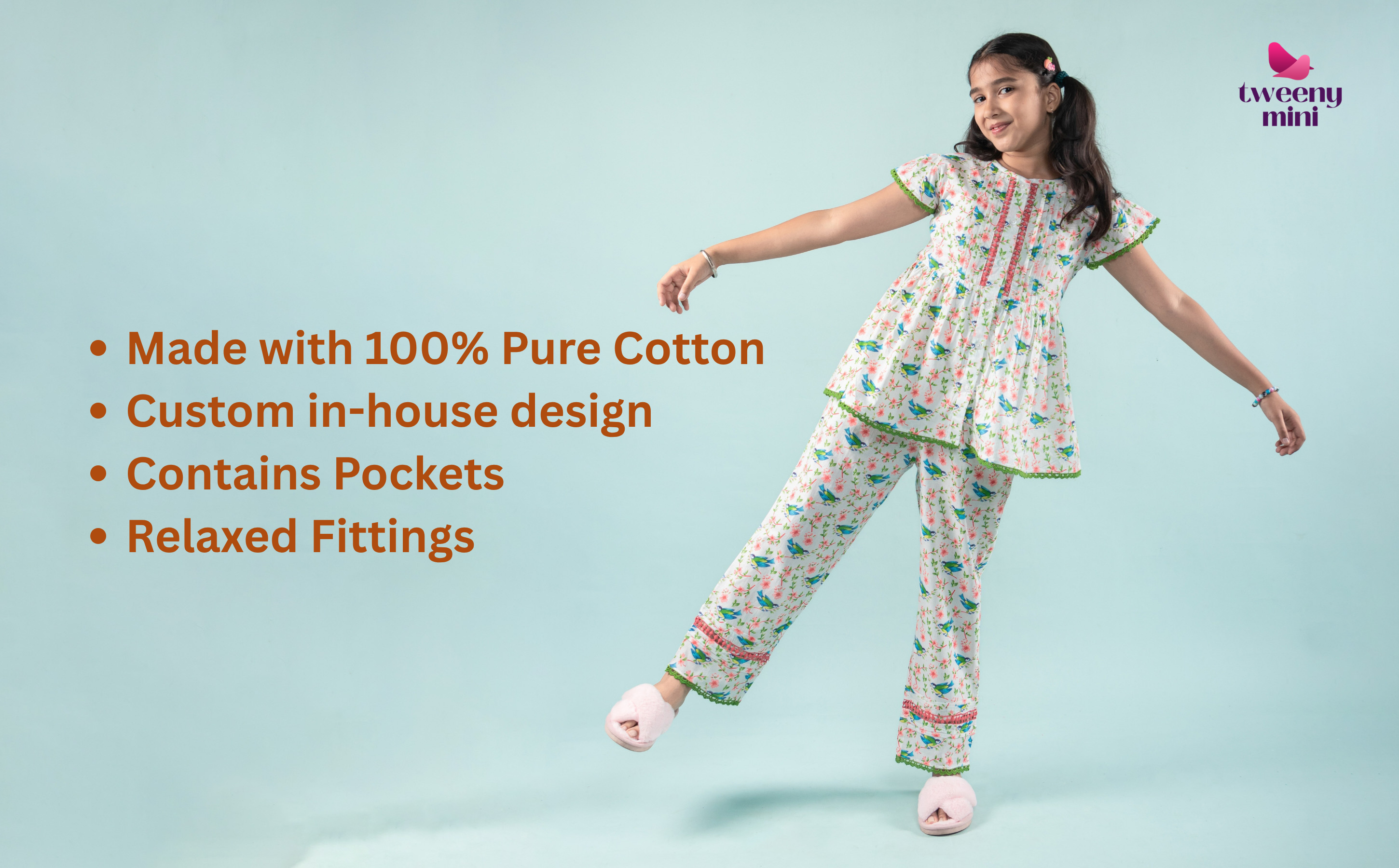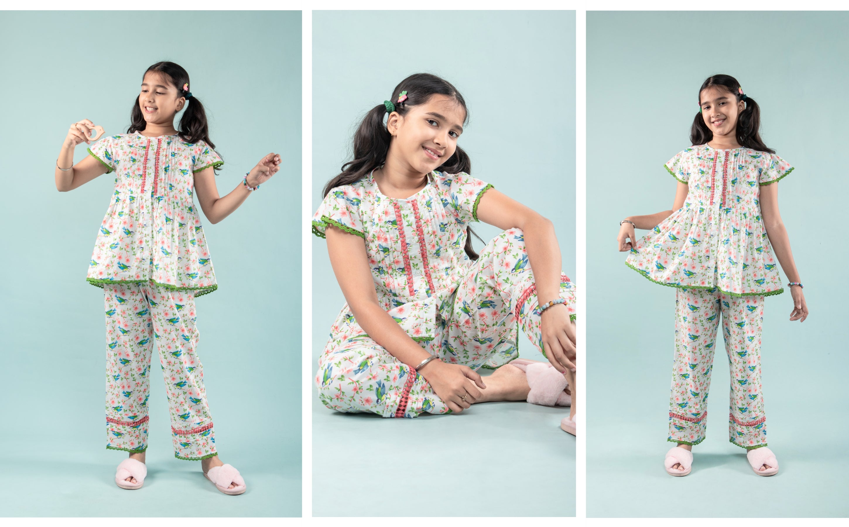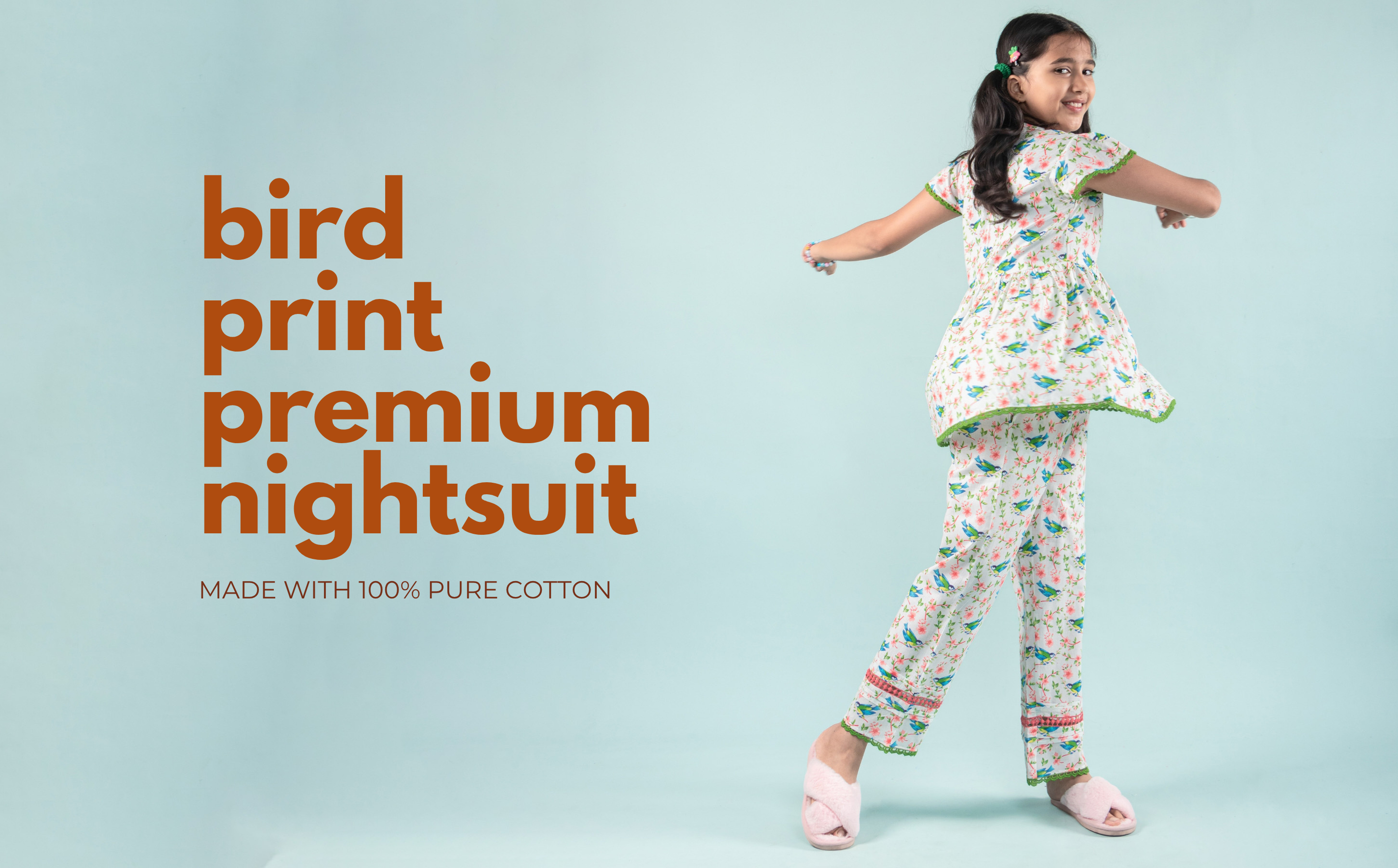 Kids love prints that spark imagination. This girls printed night suit cotton features a cute bird design in calming green shades. The nature-inspired print makes bedtime more exciting and cheerful.