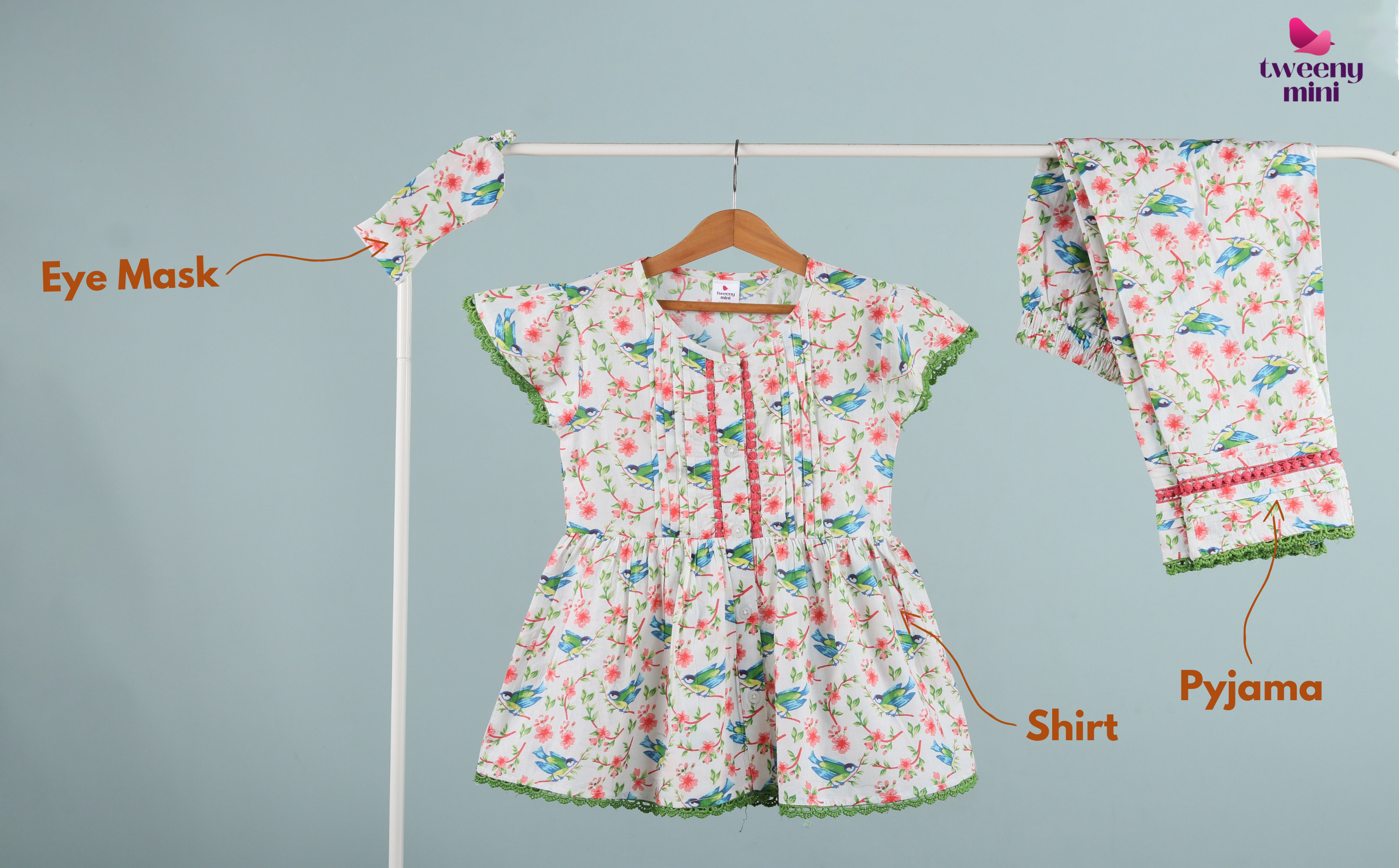 Bird Printed Girls Cotton Nightsuit with Eye Mask (Green)