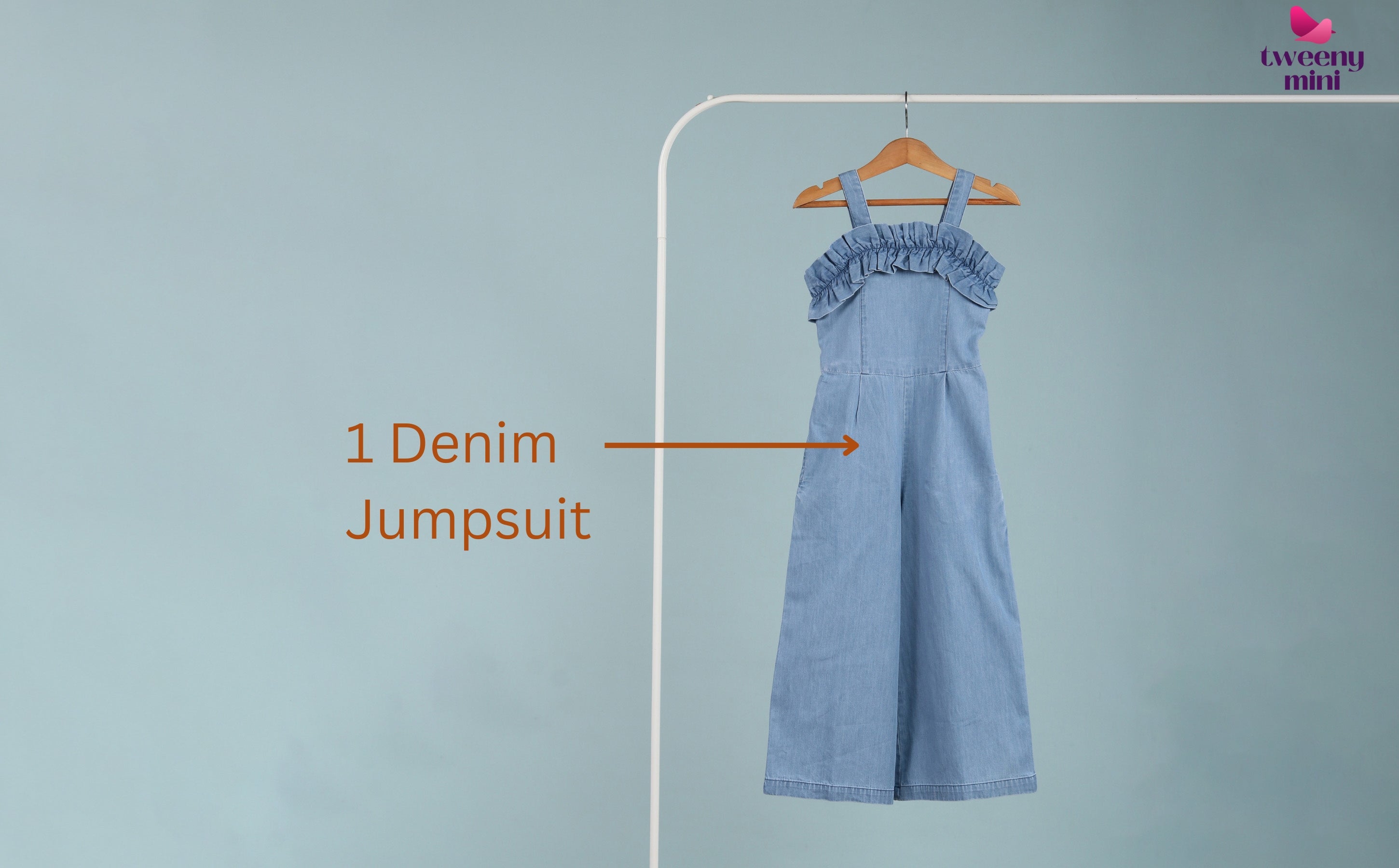 Order now and get her summer-ready with this adorable frilled denim jumpsuit!