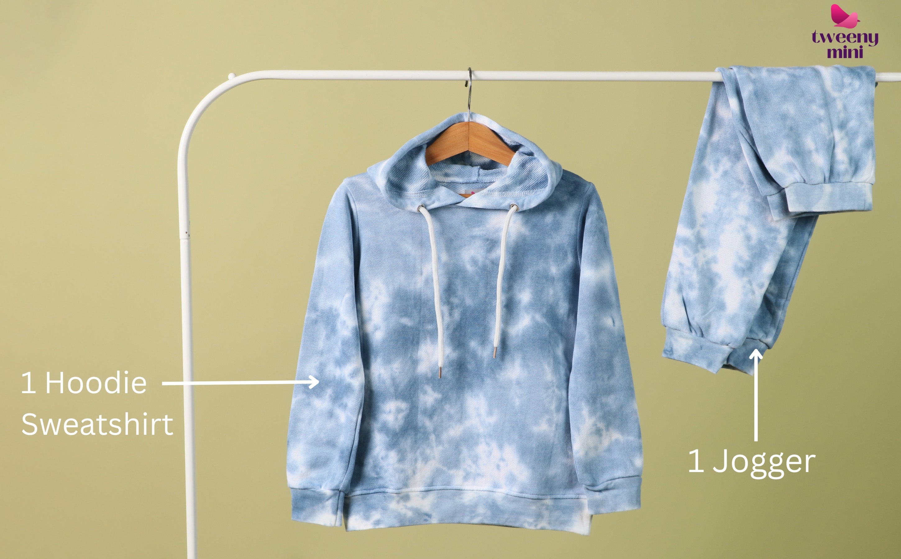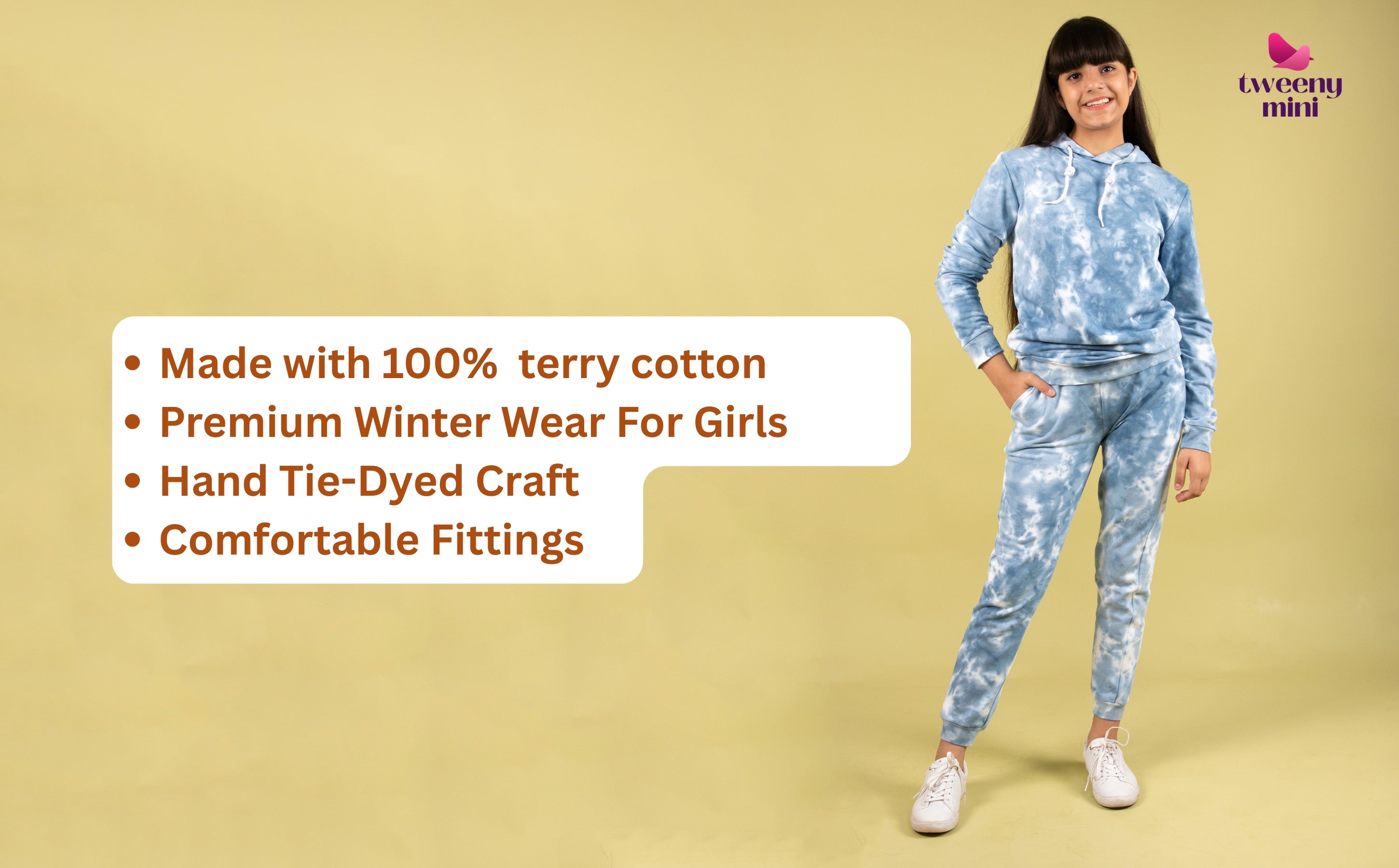 Give your child the perfect blend of style, comfort, and warmth with this beautifully crafted hoodie jogger set designed especially for growing girls. Created with soft, breathable pure cotton and finished with a striking Cerulean Blue tie-dye pattern, this outfit brings effortless coolness to chilly days.