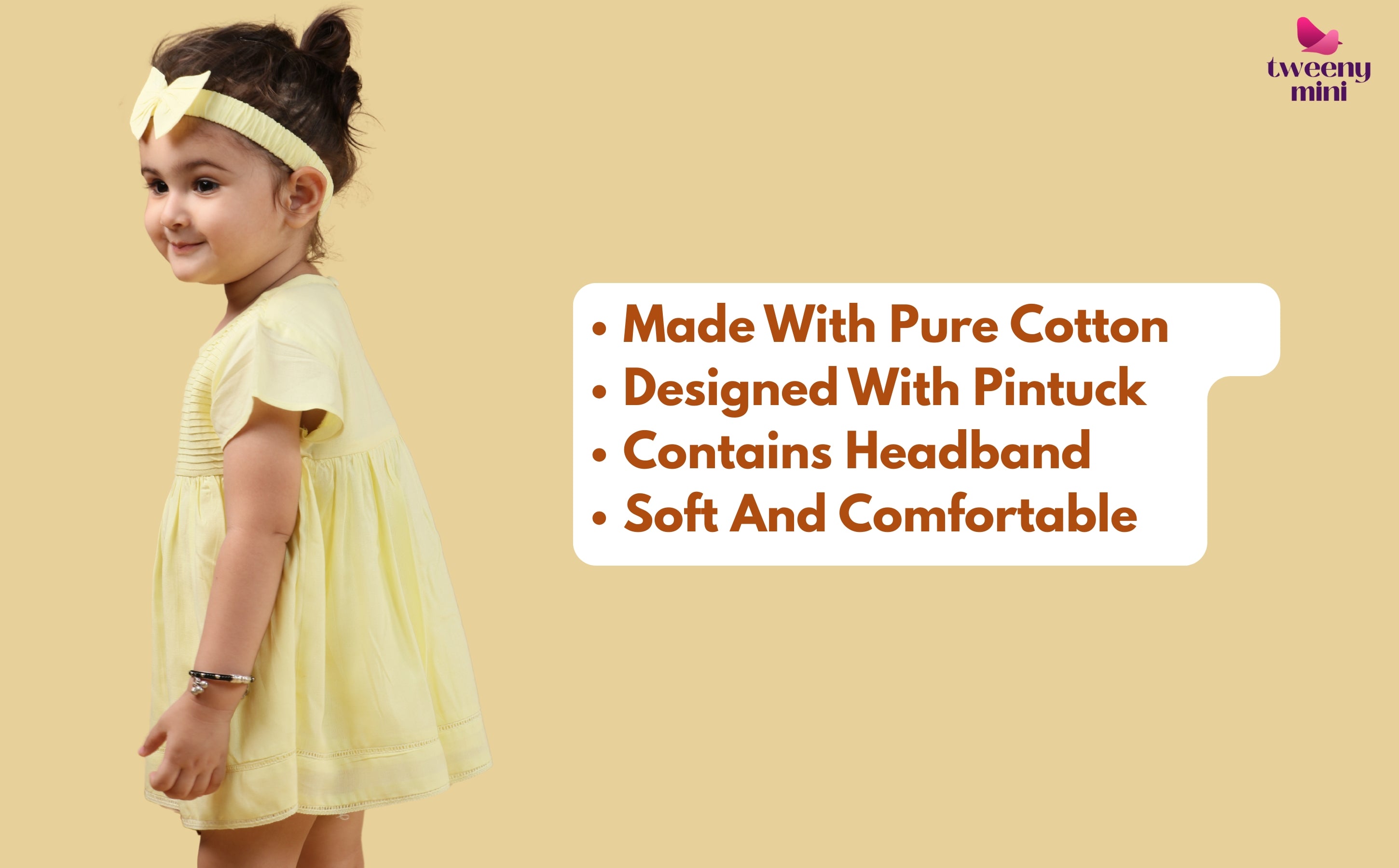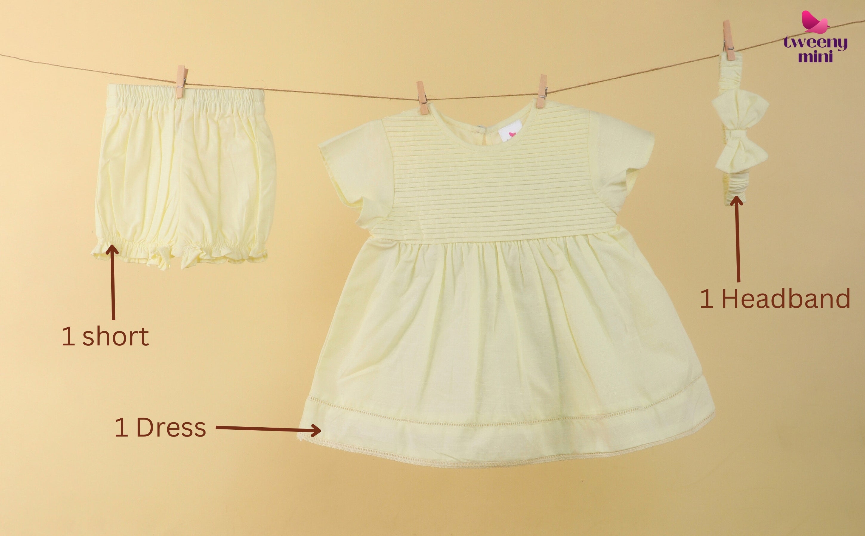 Newborn Baby Summer Frock – Pure Cotton Infant Dress with Bloomer & Headband (Lemon Yellow)
