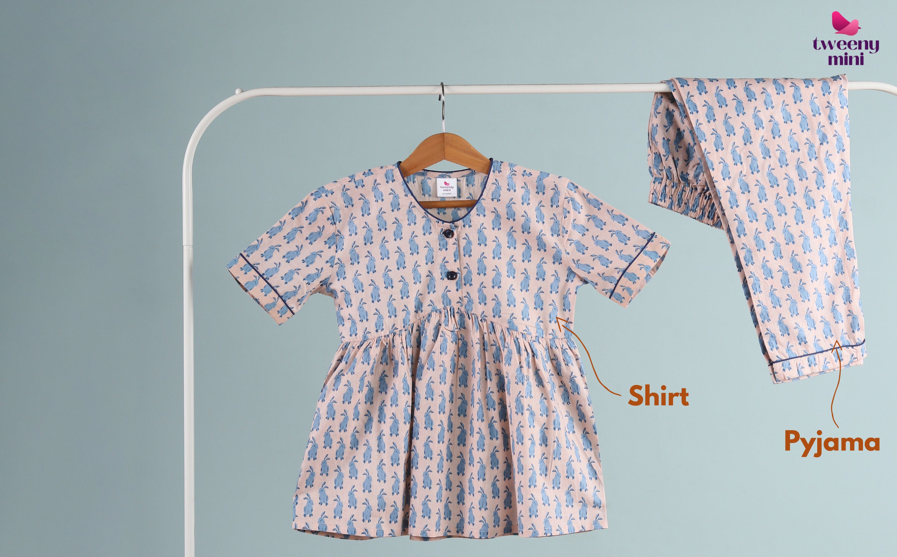 Bedtime becomes sweeter and more relaxing with this beautifully designed Night Dress featuring an adorable bunny print on a calming light-blue base. Crafted with soft, breathable cotton and styled for comfort, this two-piece set is perfect for kids who love cozy nights, playful prints, and fuss-free sleepwear.