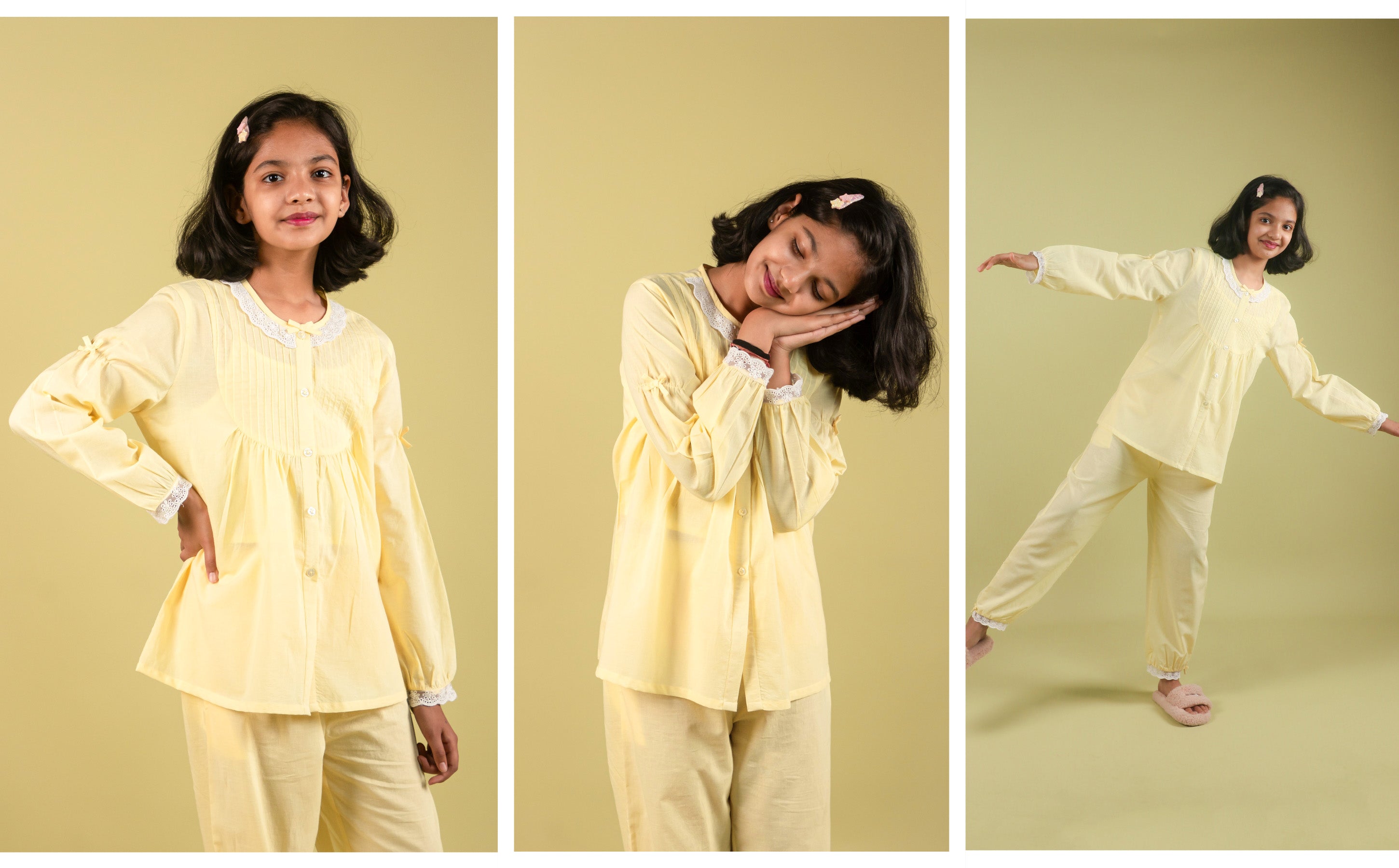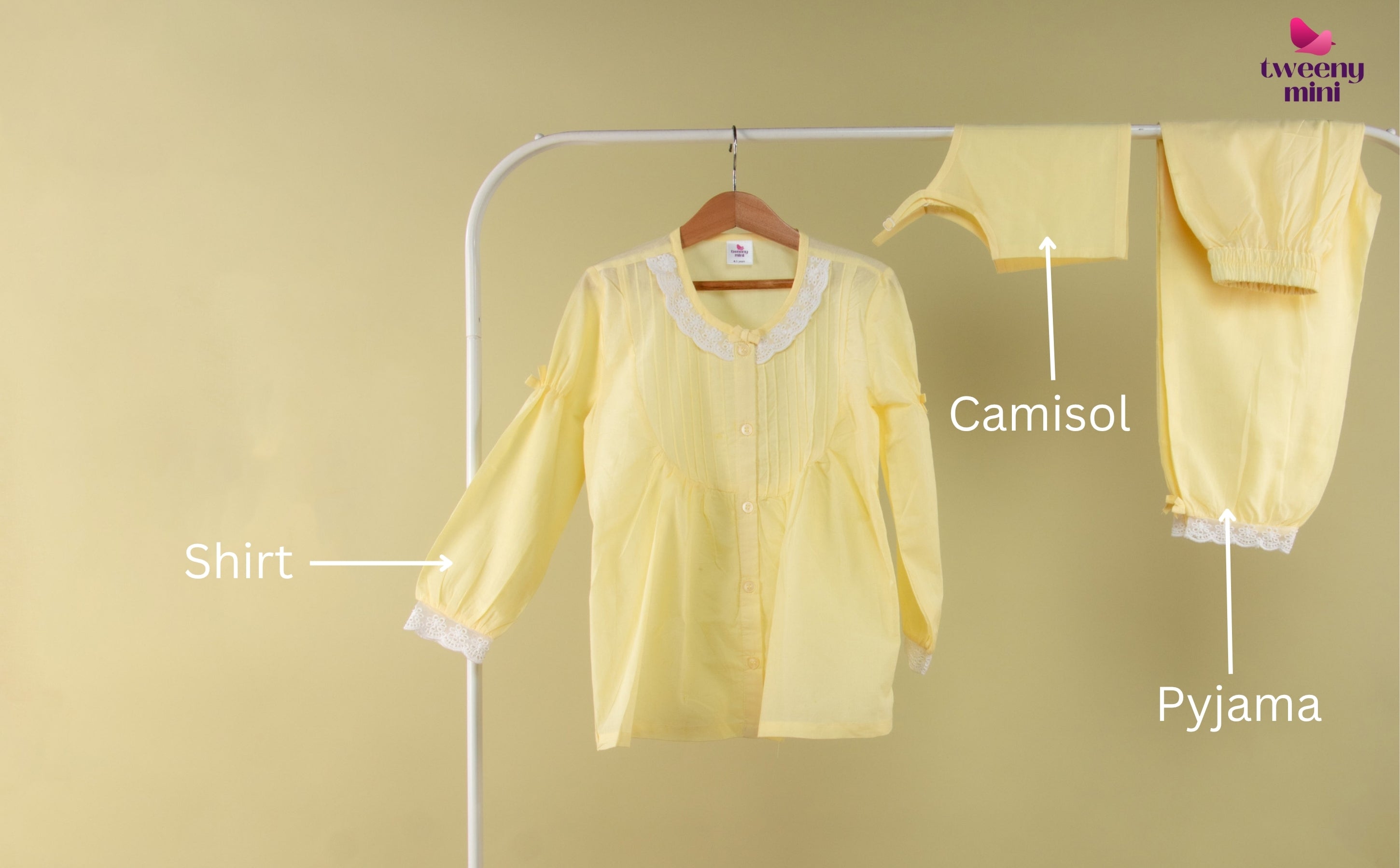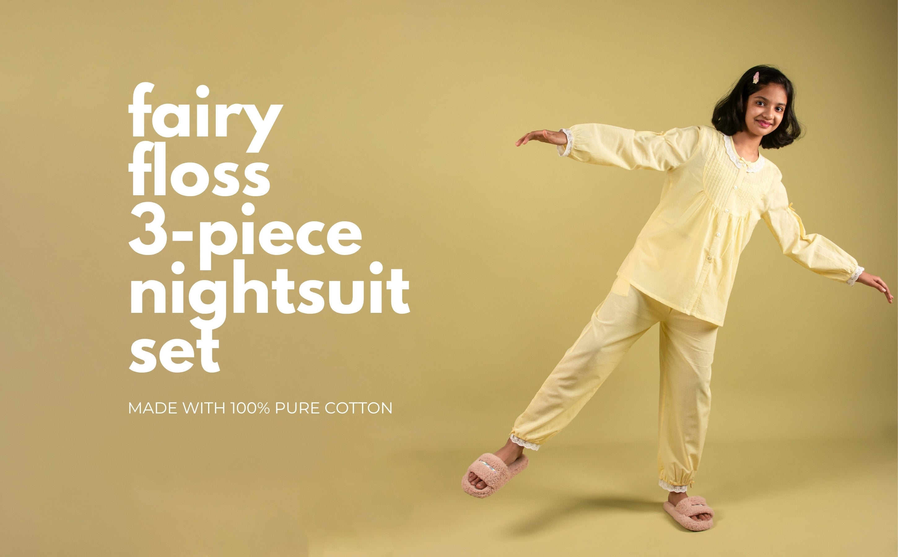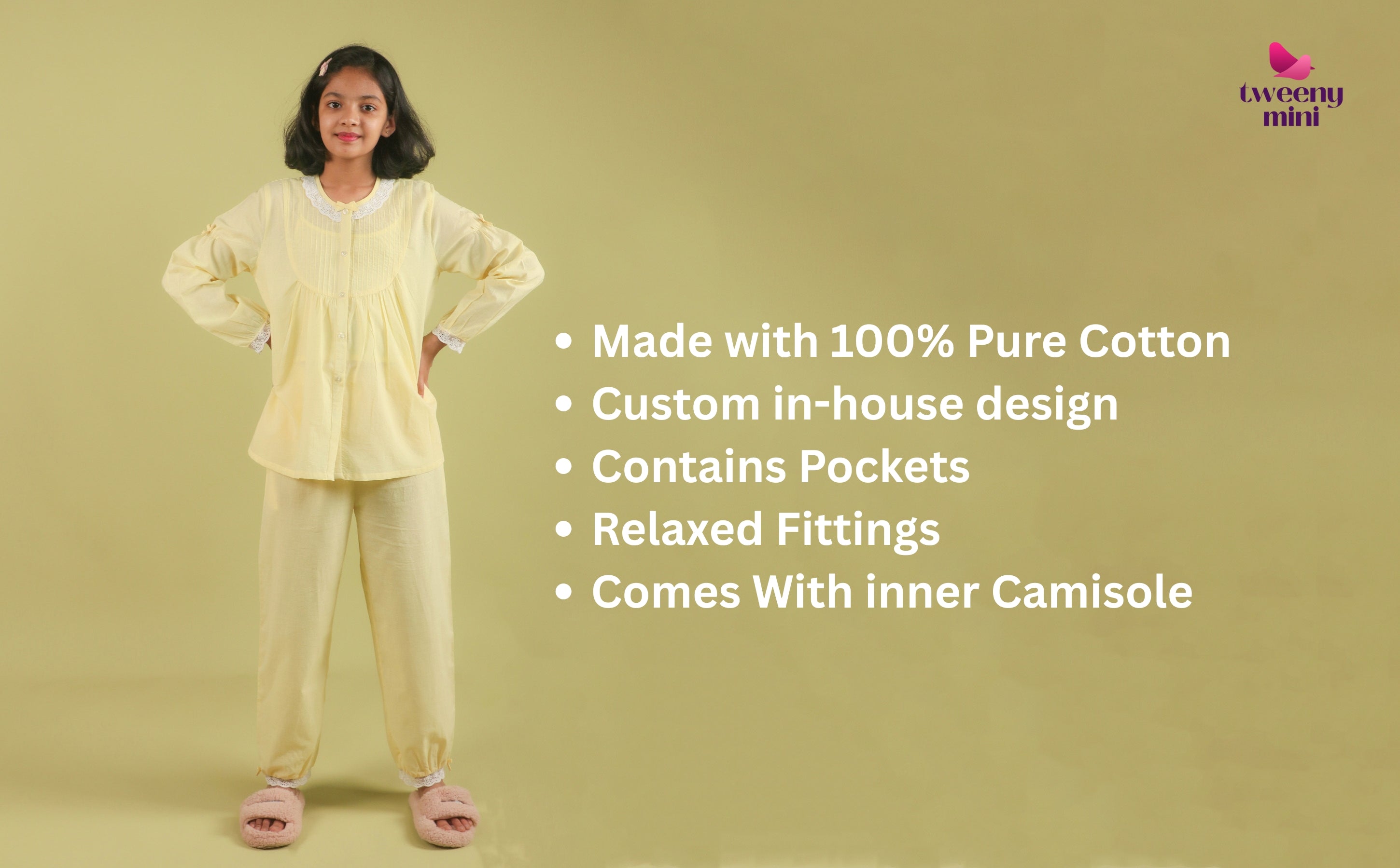 Fairy Floss Pastel Cotton 3-Piece Nightwear for Kids Girls – With Inner Camisole (Pastel Yellow)