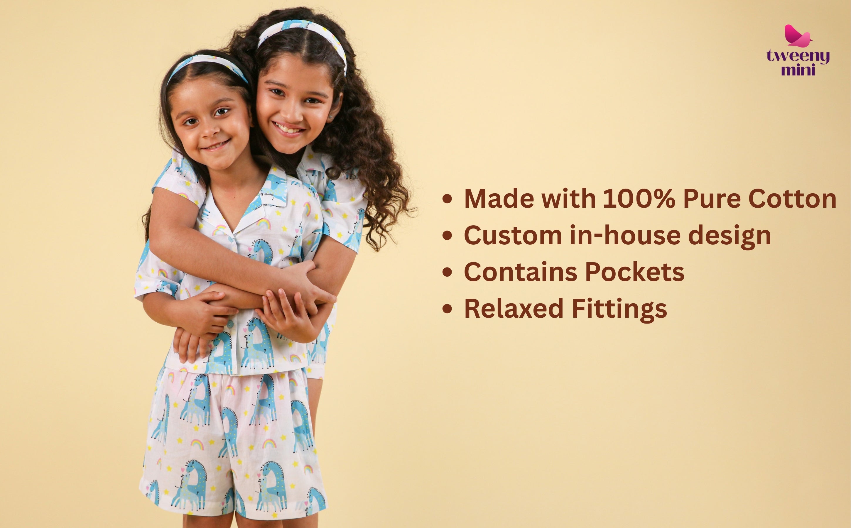 Looking for a stylish cotton sleepwear set for girls? The collared shirt gives it a polished touch. It’s a collared cotton night dress for girls with a fun twist.