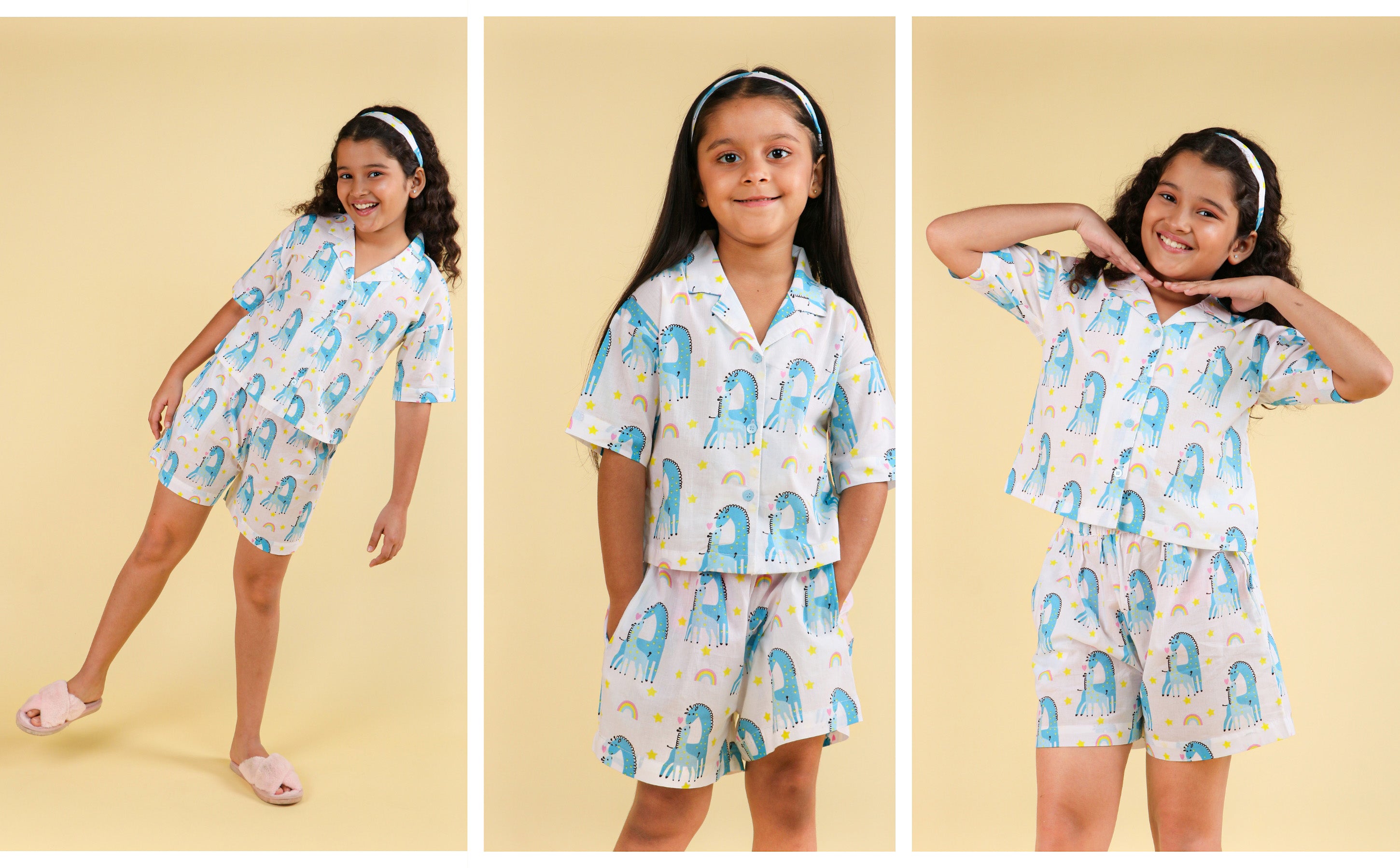 This set is not only sleepwear—it also works as a trendy summer night dress for girls or a lounge outfit. The collared shirt and shorts can double as a casual home set.