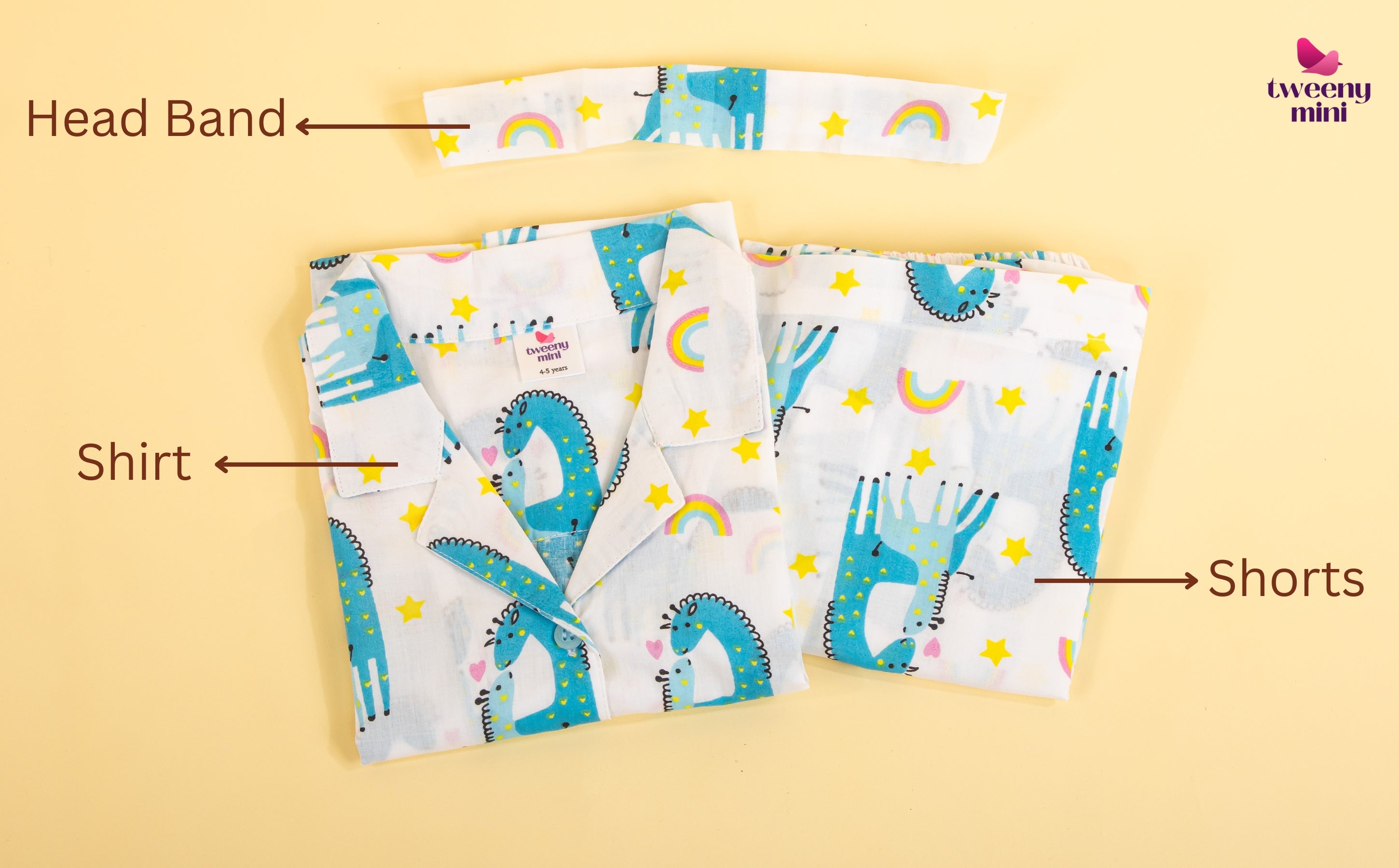 The blue and white color combination adds a calm vibe. It is both trendy and timeless. A cute giraffe print summer night dress for girls brings fun and joy to every night.
