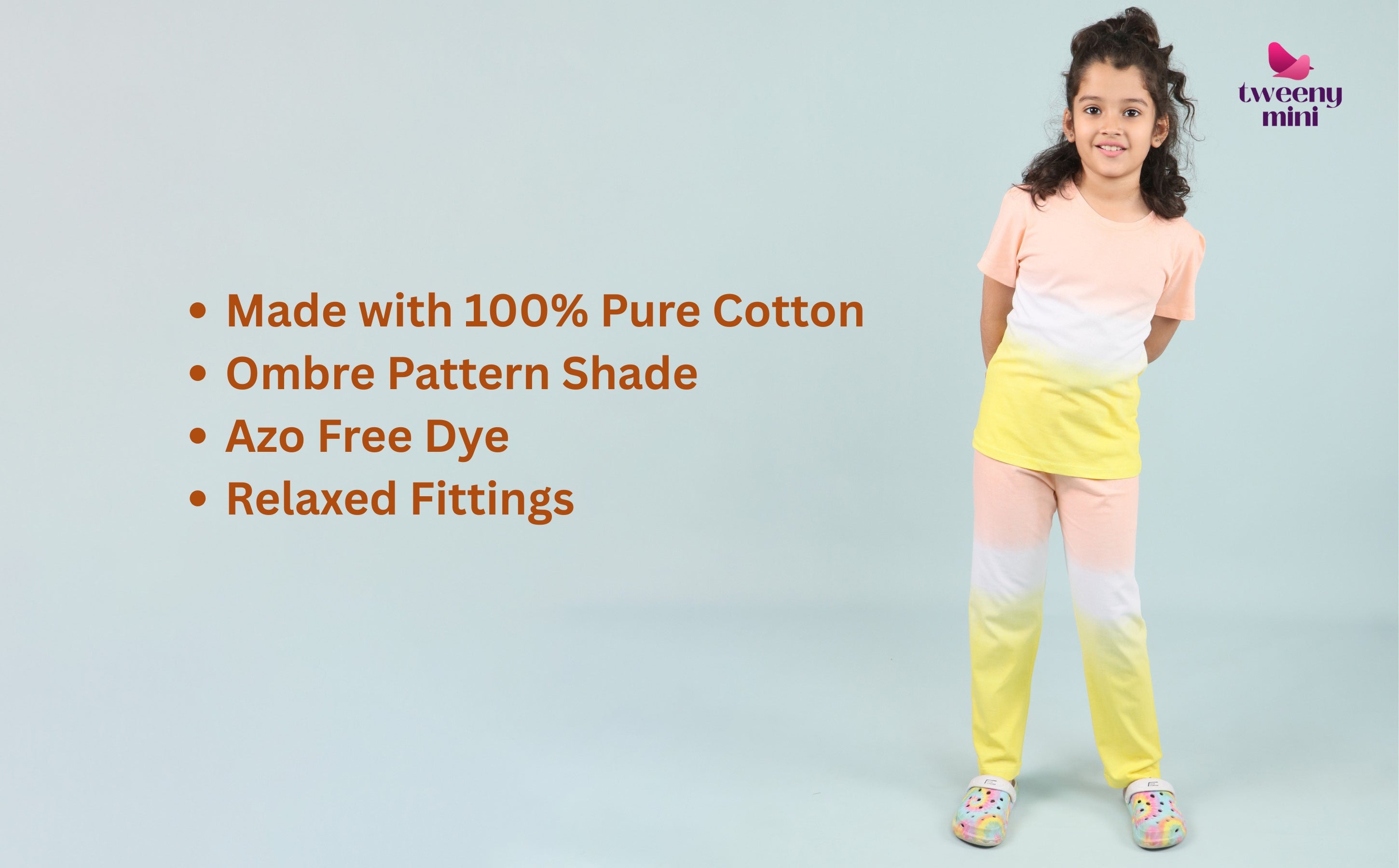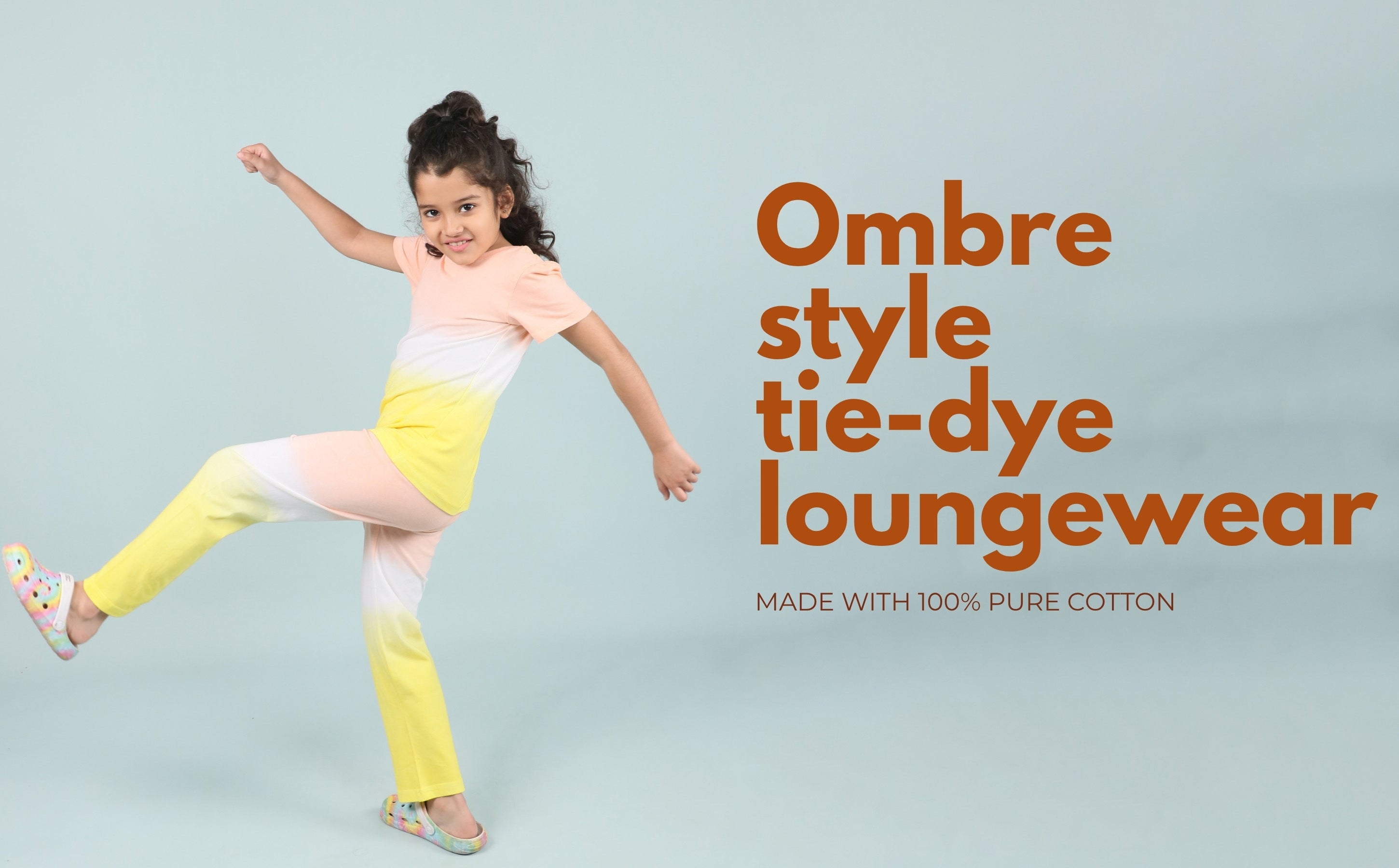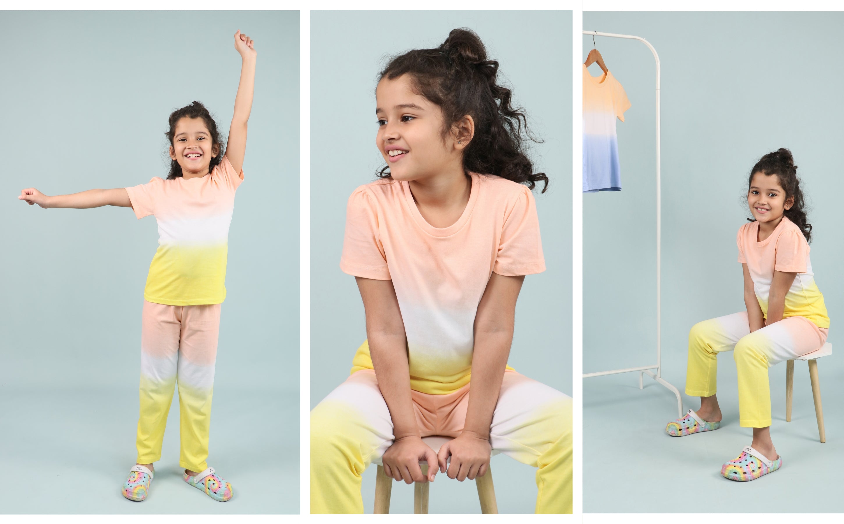 The soft Yellow Peach color is cheerful yet calm. The classic Girls Sleepwear Set Cotton Tie Dye silhouette gives her the freedom to be herself, whether she's in bed or on the couch.
