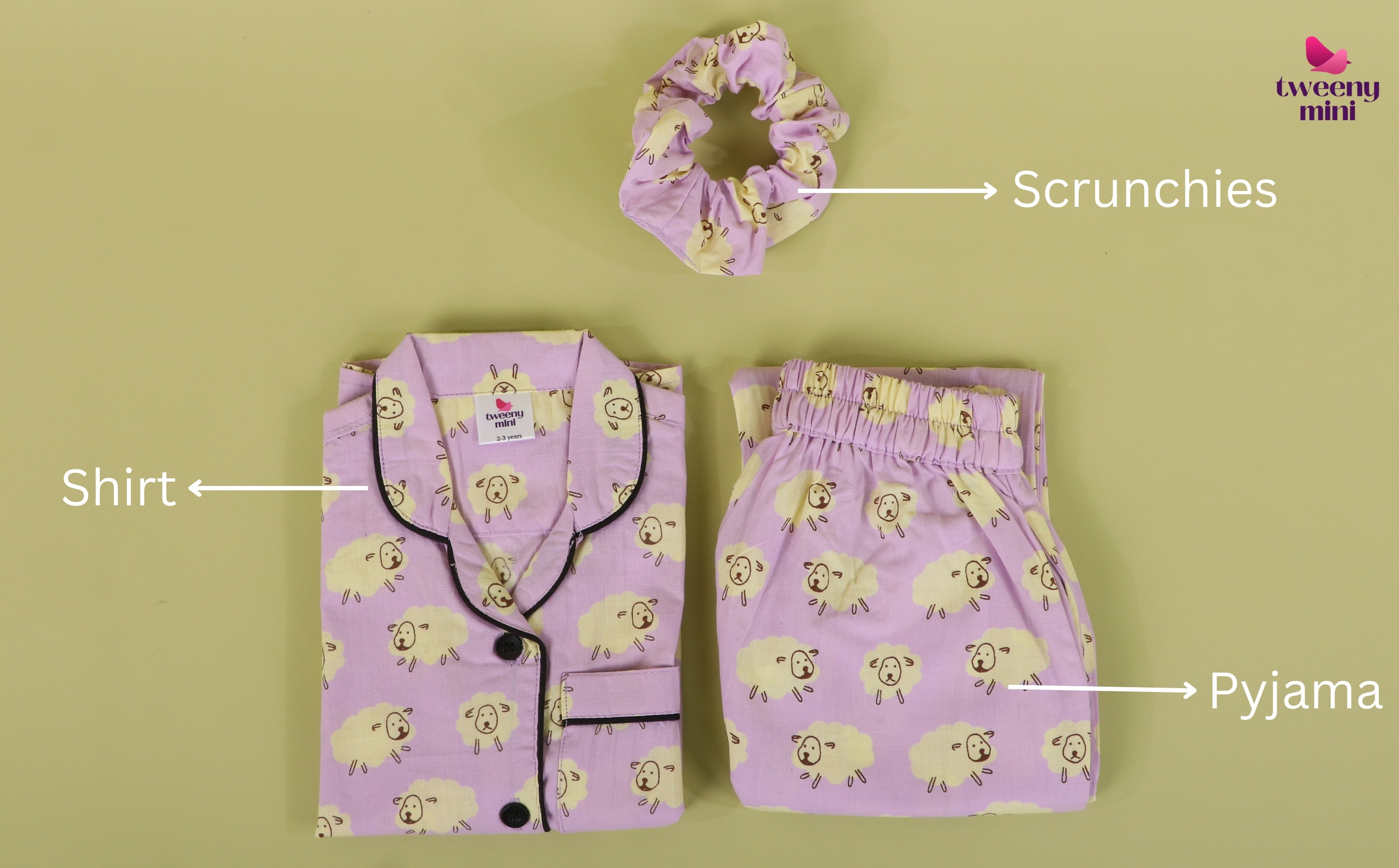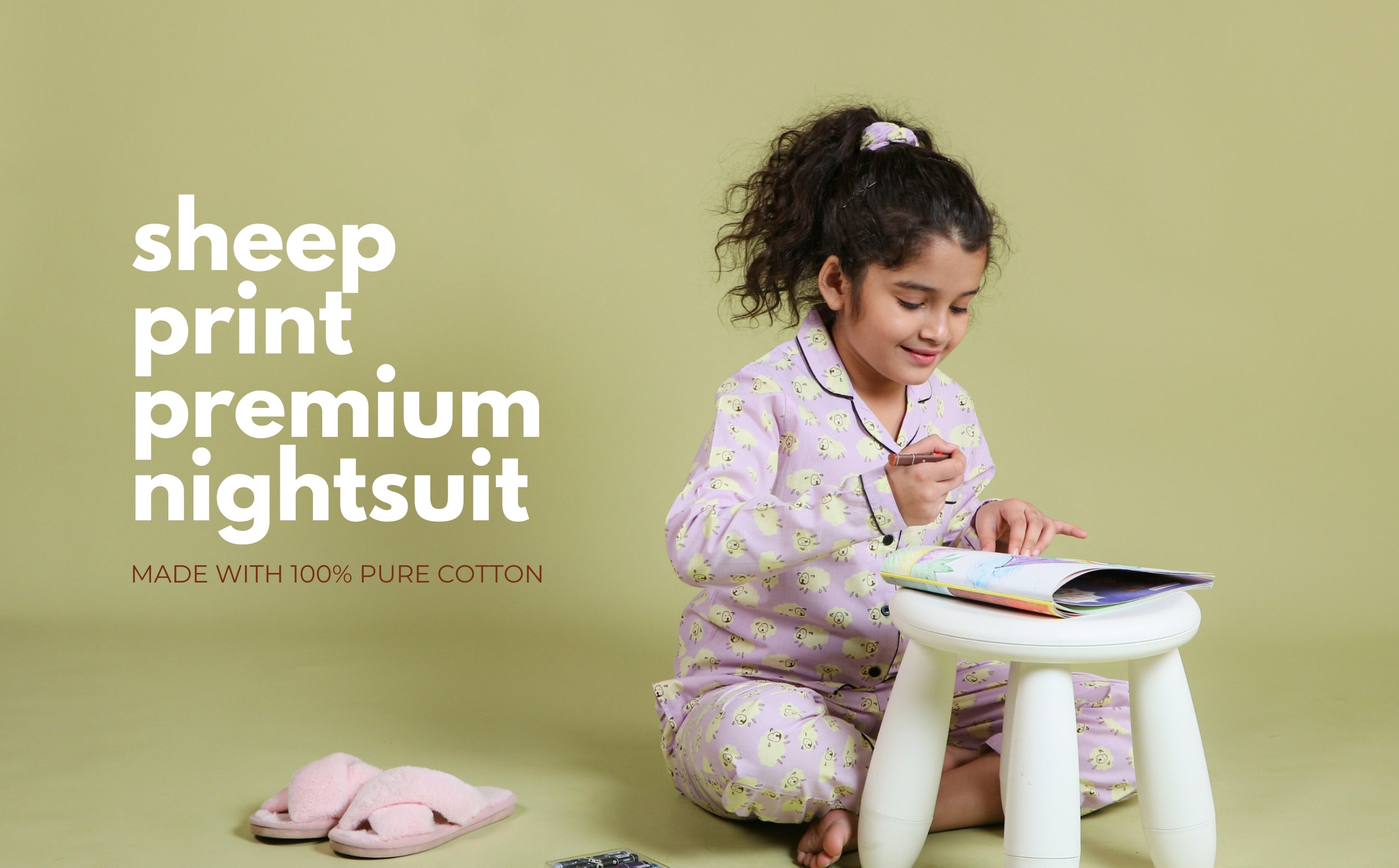 Little Sheep Lavender Printed Nightsuit for Girls – Pure Cotton Comfort for Sweet Dreams