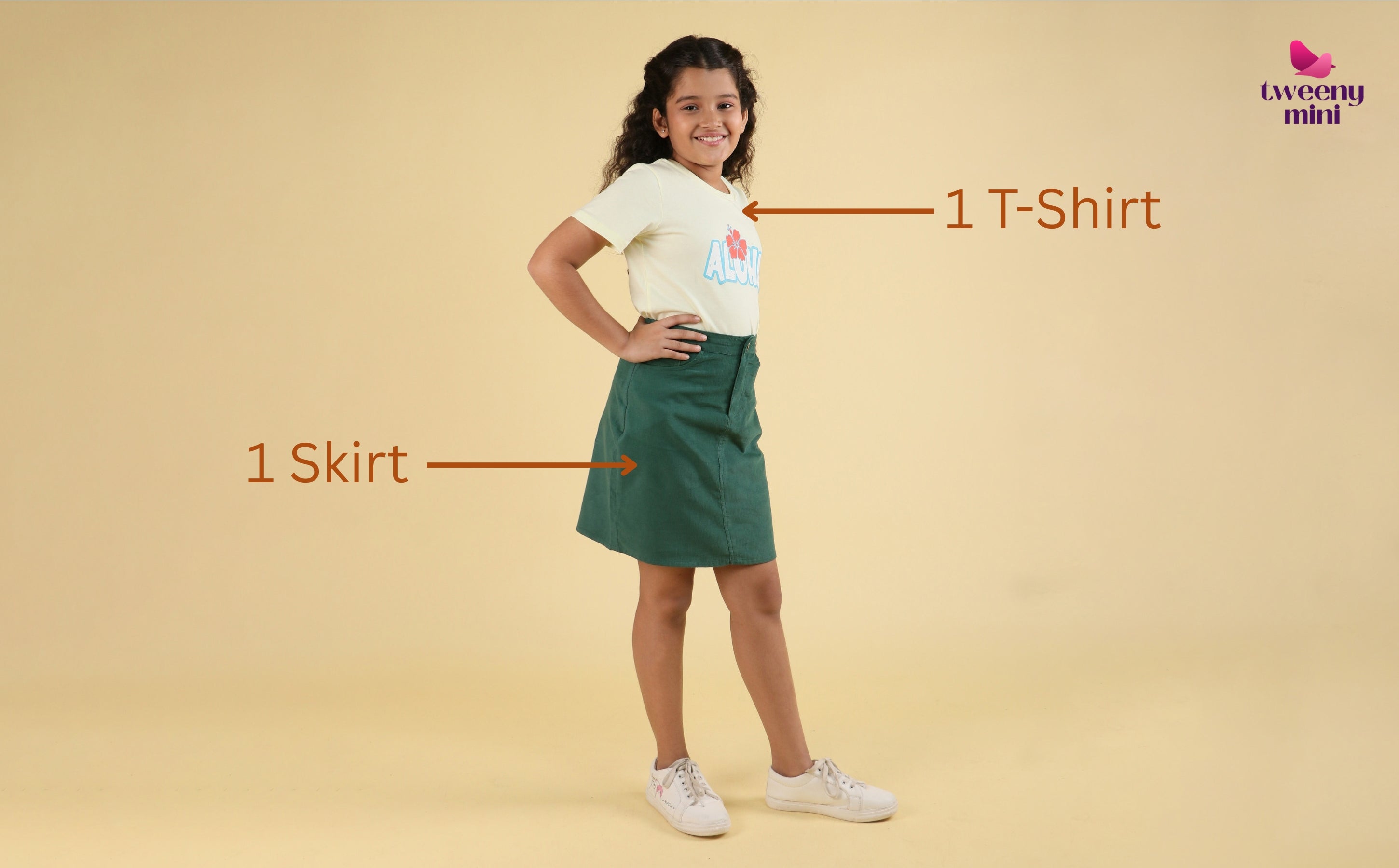 The fresh yellow tone compliments the green skirt beautifully, creating a balanced trendy top and skirt for kids look. Your little girl can wear this tee even separately with jeans, tights, shorts, or joggers—giving you extra styling value.