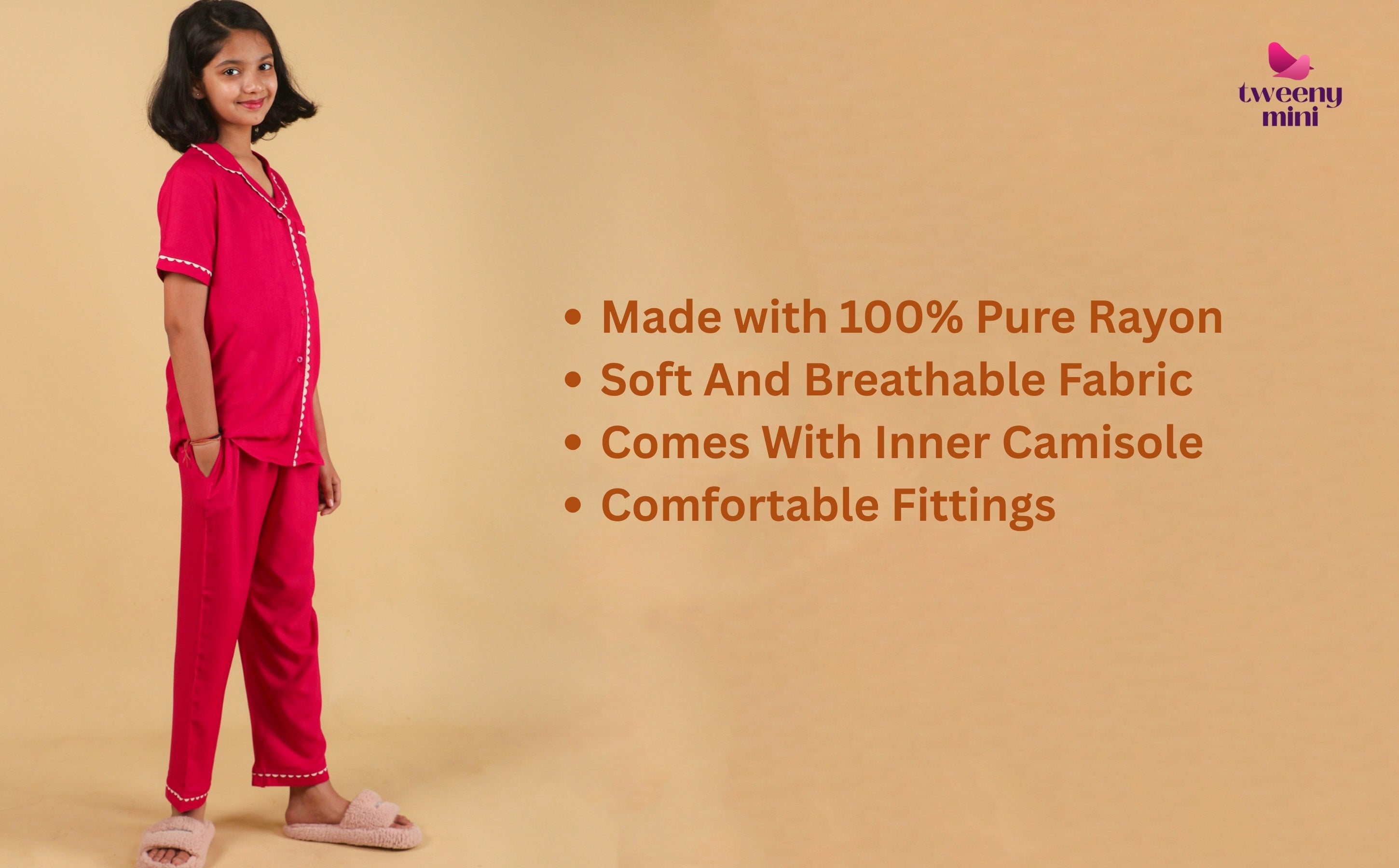 The inner camisole stands out as one of the most loved elements in this best nightsuit for girls. With soft ruching and adjustable straps, it delivers the perfect blend of style and composure. Kids can wear it under the shirt for a layered look or wear it alone on hot nights. The smooth rayon helps them stay cool even when temperatures rise.