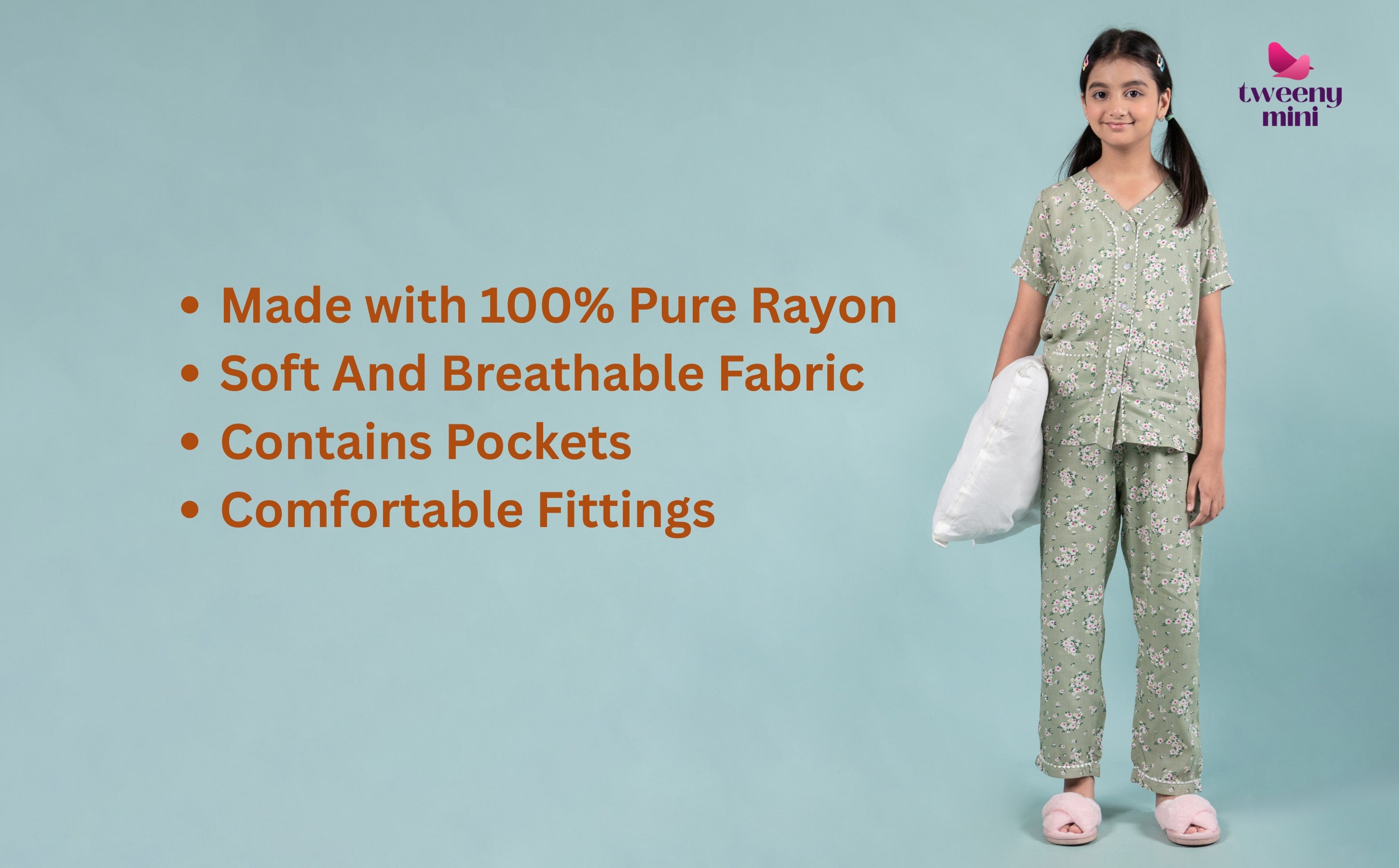 This is more than just a pyjama outfit—it is an eco-conscious choice. Made with natural rayon fibre and skin-friendly dyes, this floral nightwear set for girls avoids polyester and harsh synthetic blends. It is safer for sensitive skin and better for the environment.